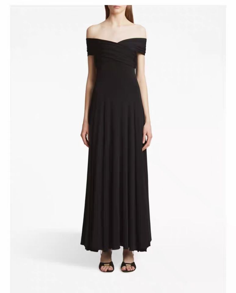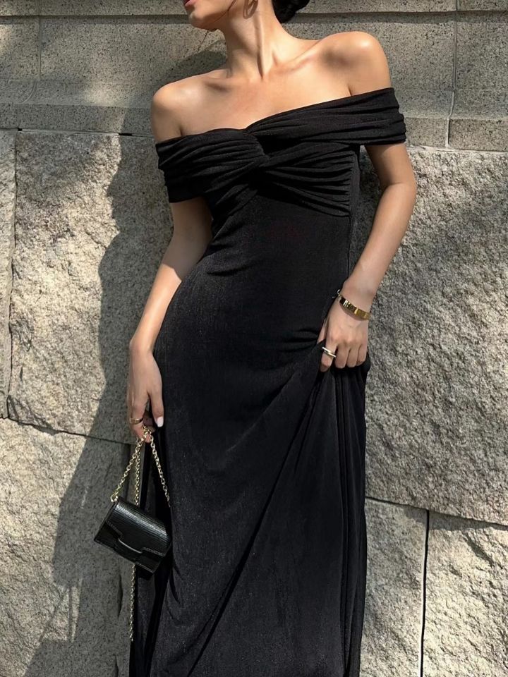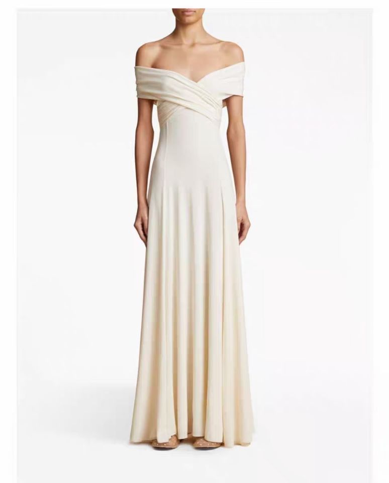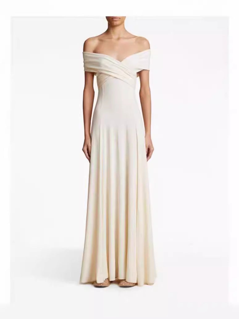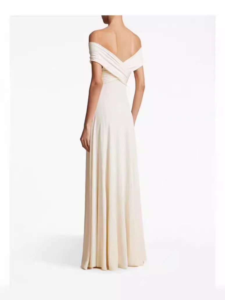 Plataz Temperament Sexy Word Collar Twisted Folds Folded White Evening Dress Dress Dress Dress Dress Woman
