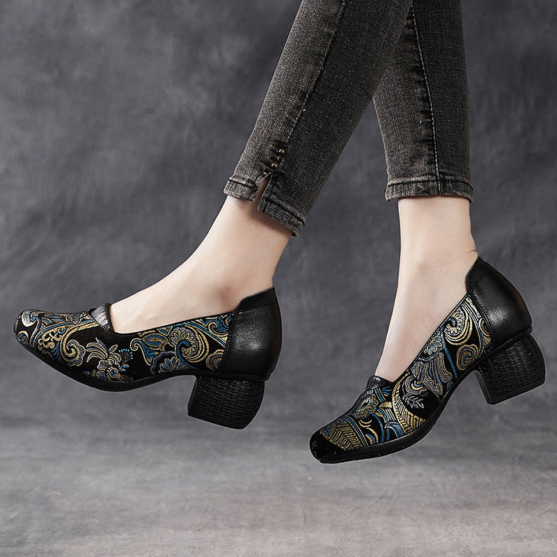 Plataz Beauty Real Leather National Wind Coarse And Shallow Print Comfortable Chinese Style Original Fashion Mother Shoes Lefu Shoes High Quality Shoes