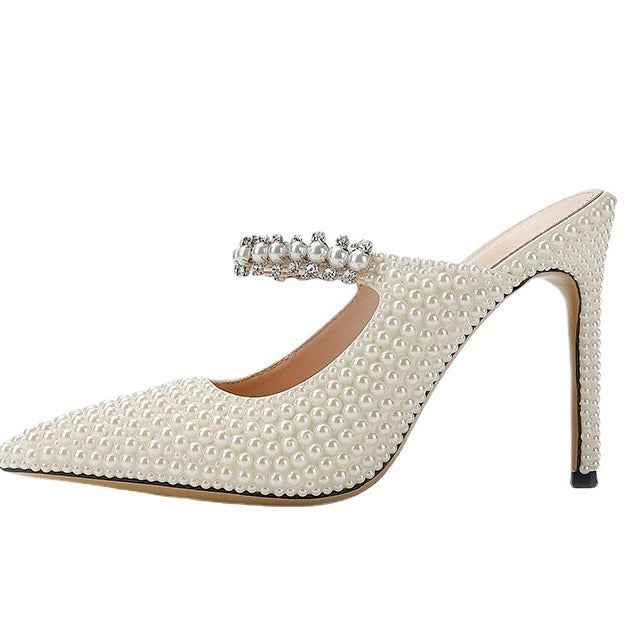 Plataz Women's Shoes Brand White Pearl Tip High Heel Fashion Half-Empty Ladies Sandals High Quality Shoes