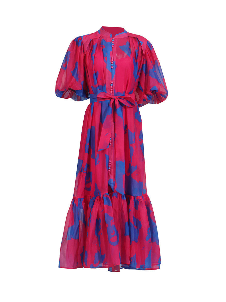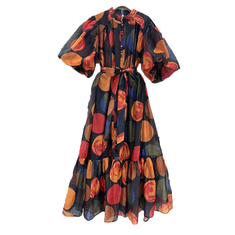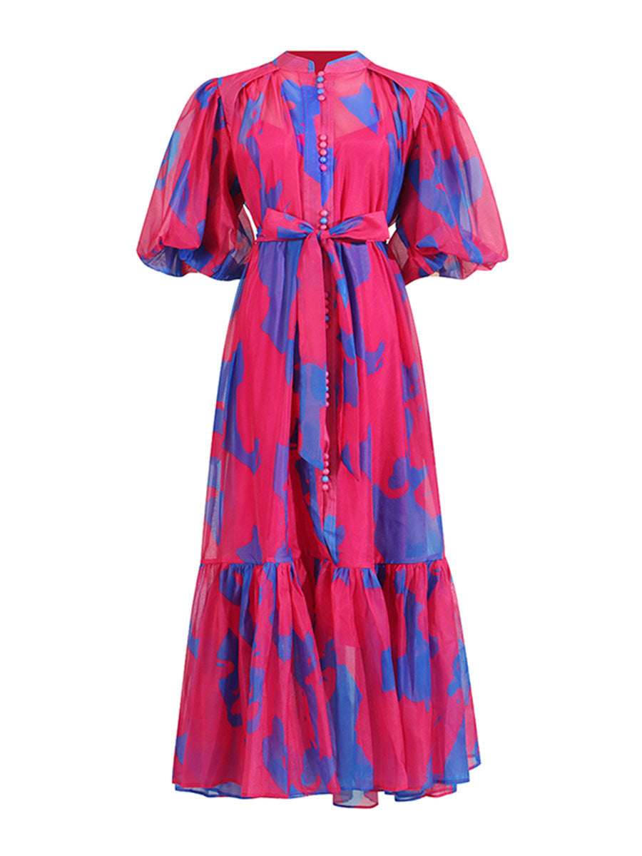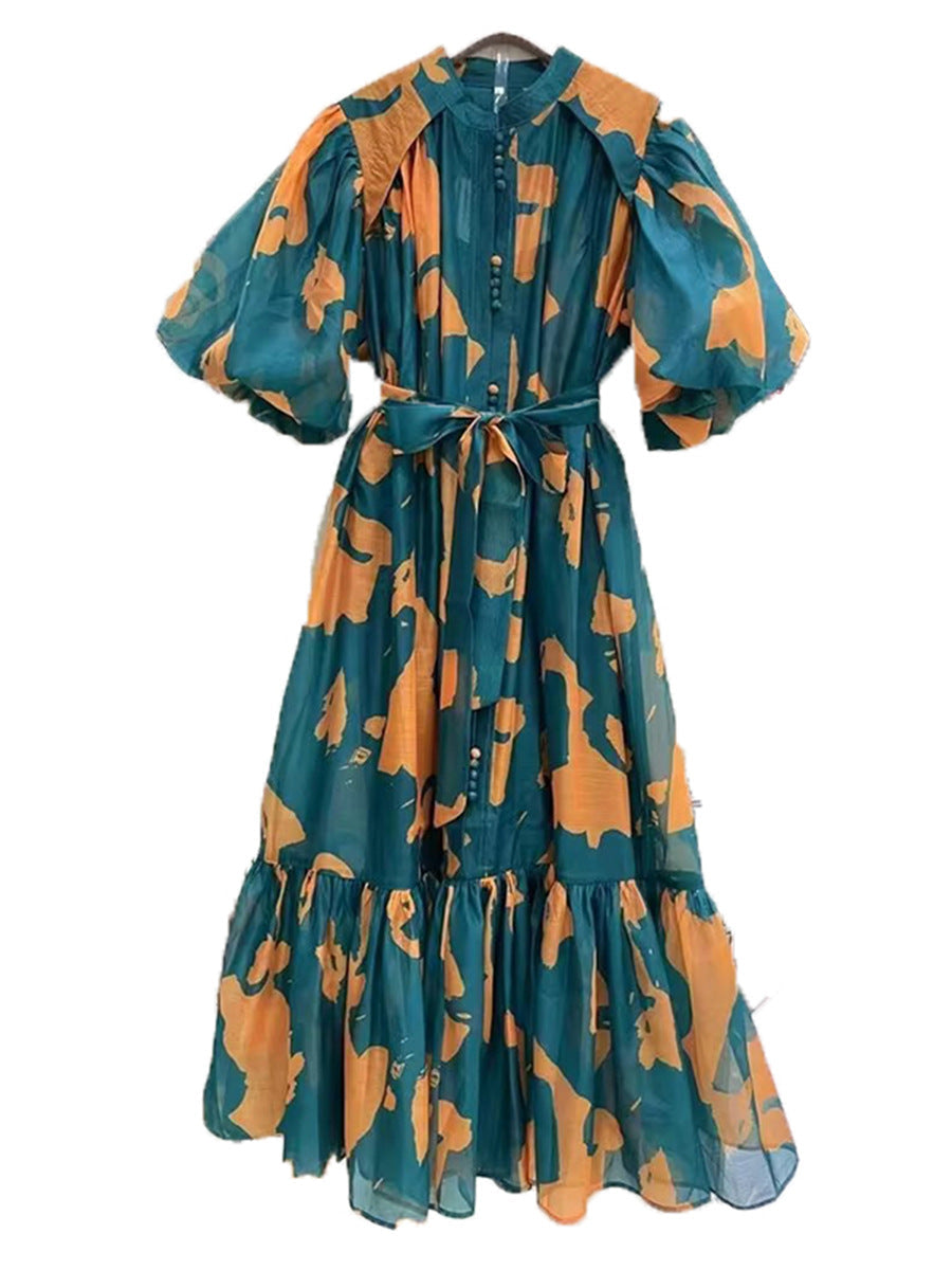 Plataz And Leisure Holiday Dress 2025 Summer New Loose Print Bubble Sleeve Tie Waist Dress