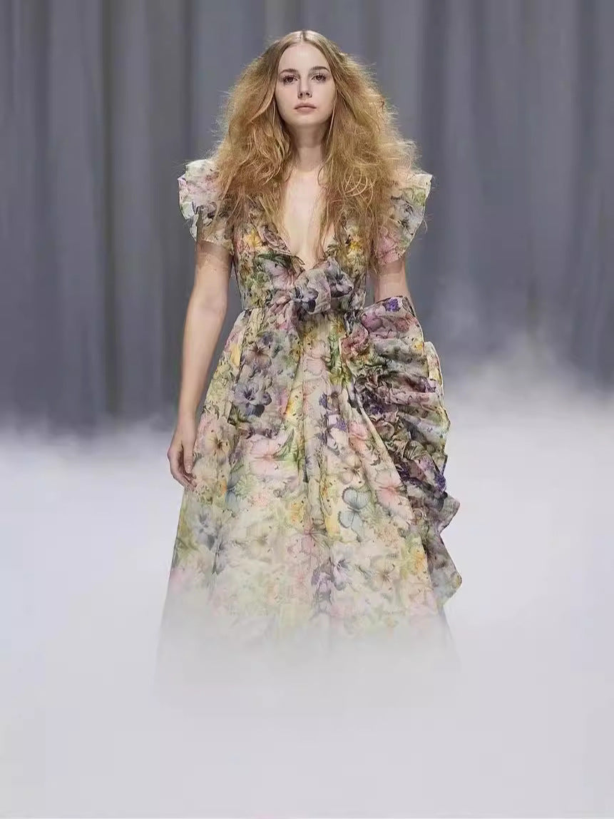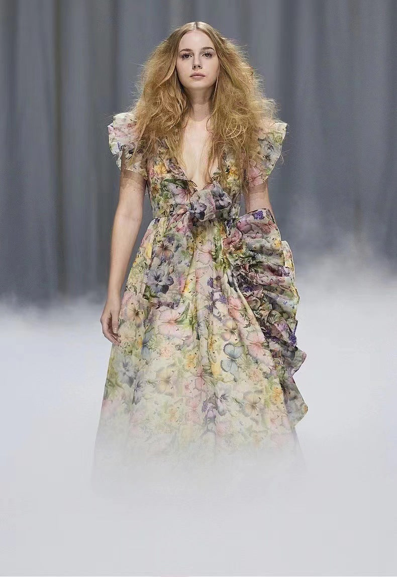 Plataz Australian Minority V-Leading Flying Sleeves Of The Same Holiday Wind Bow Bow Waist Dress Dress Dress Woman