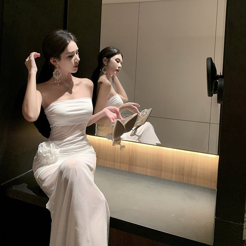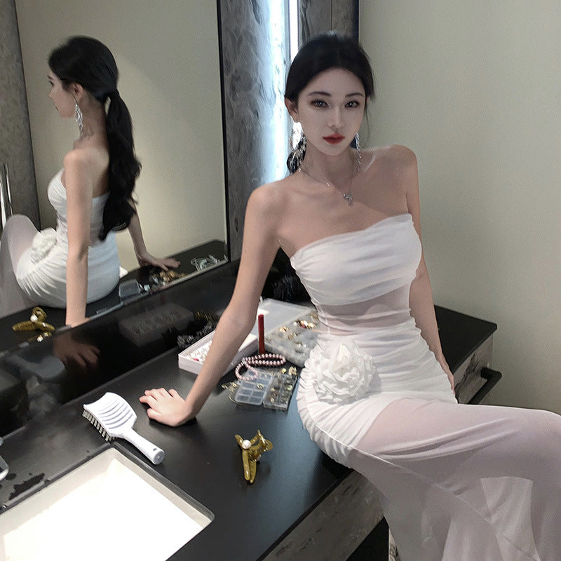 Plataz Holiday Style Sexy Perspective Mesh Yarn Flowers With Breasts Women Design Sense Of Body Quality Dress