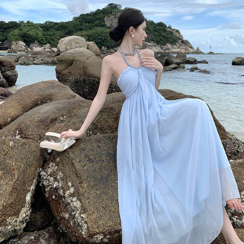 Plataz Neck Sling Dress Women's Summer Chiffon High-End Feel Super Fairy Temperament Seaside Holiday Dress