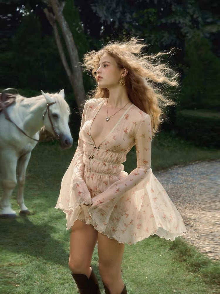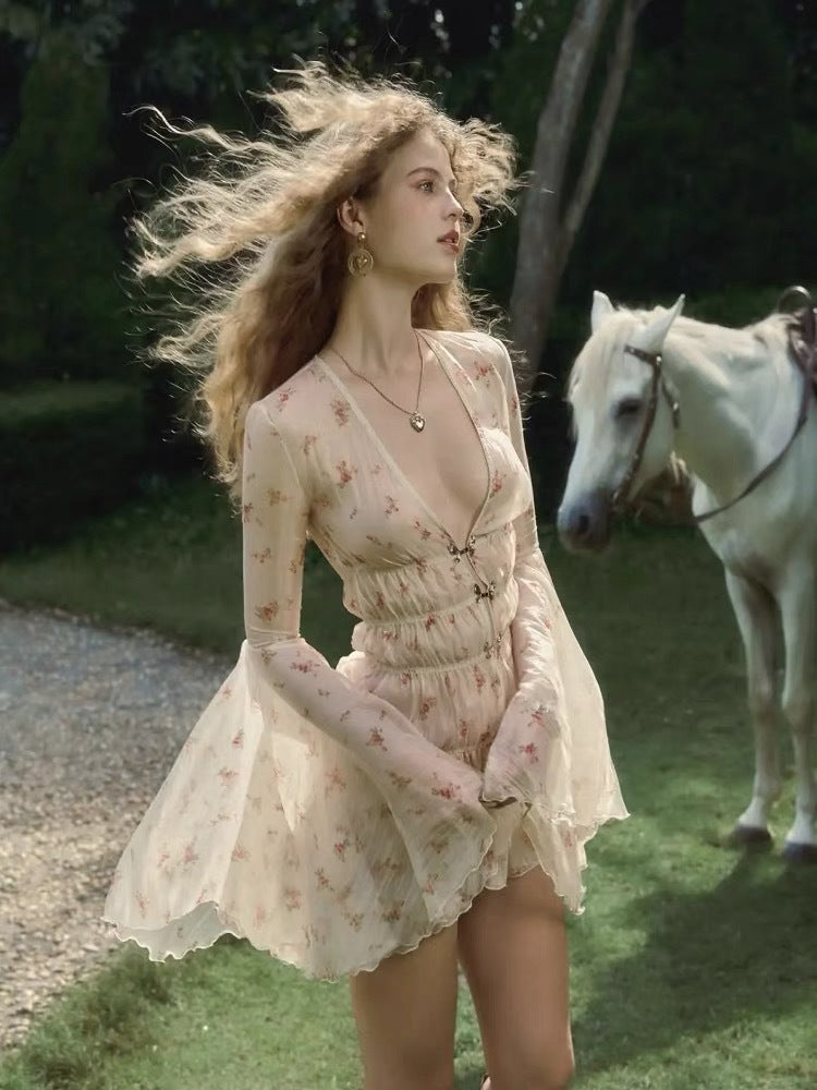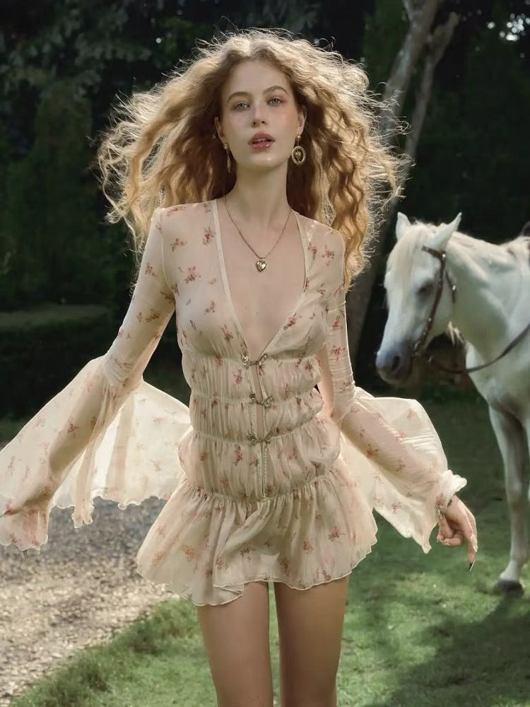 Plataz Niche Pure Lusty Sweet V-Neck Crumb Dress Horn Sleeves To Close The Waist Thin Atmosphere Holiday Dress