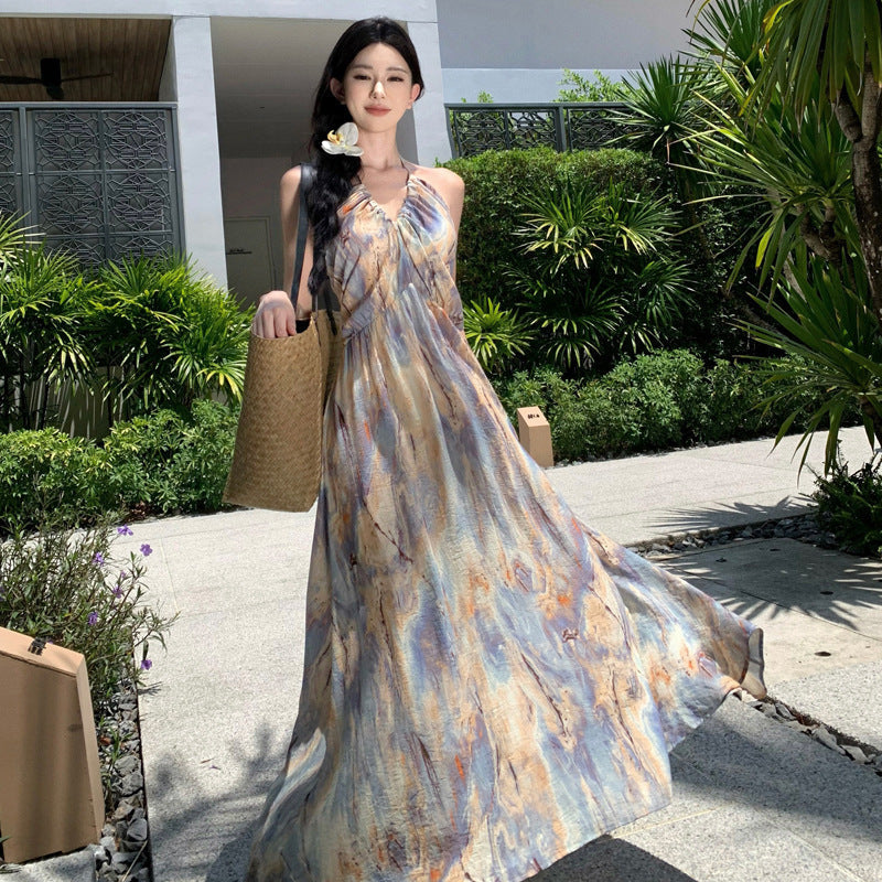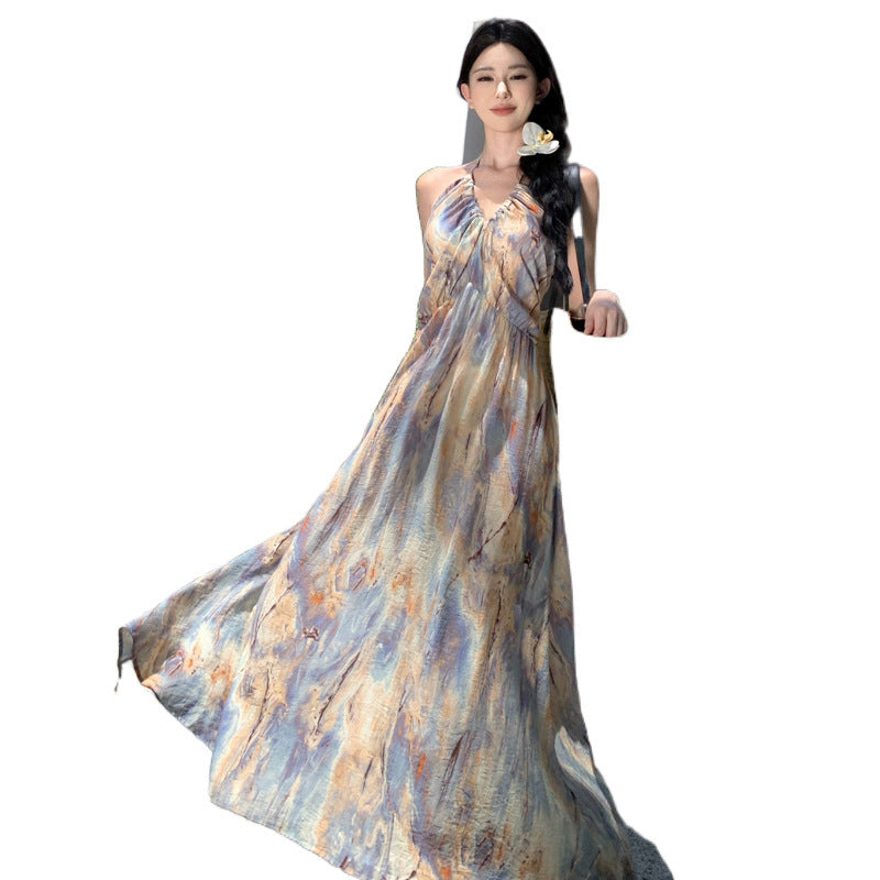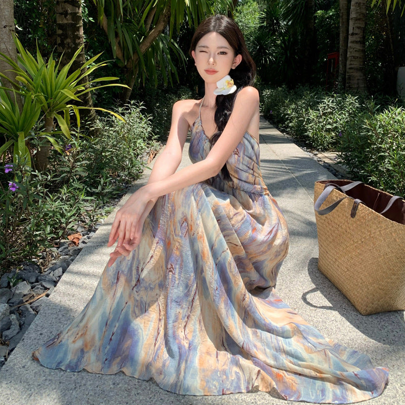 Plataz Retro Oil Painting Smashed Flowers To Take The Sling Dress To The Waist Dress Seaside Holiday Showback Beach Dress Woman
