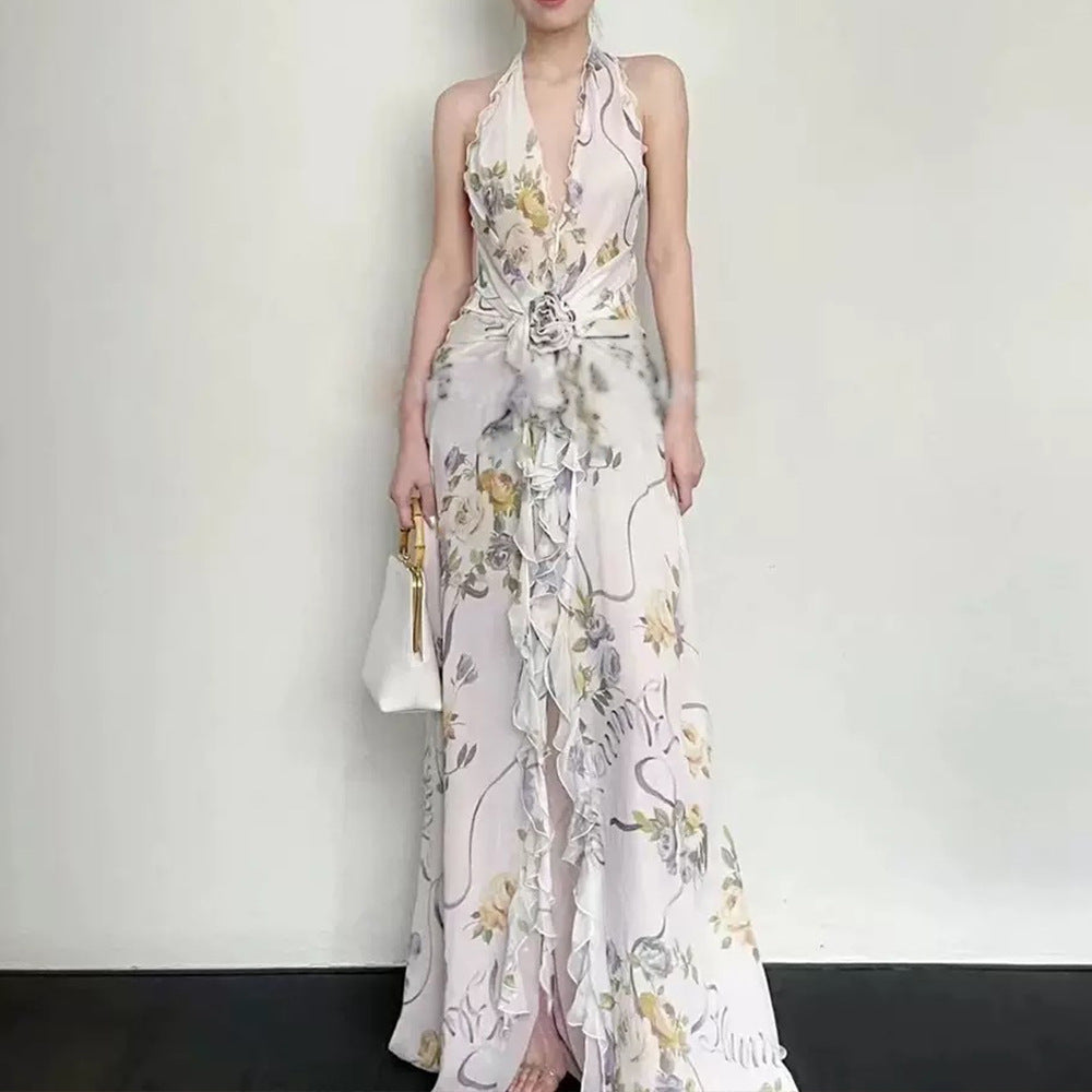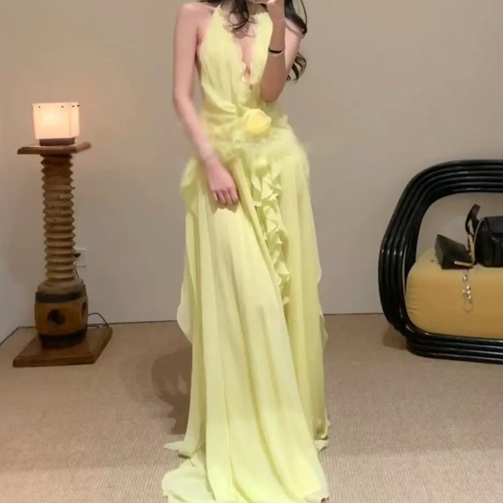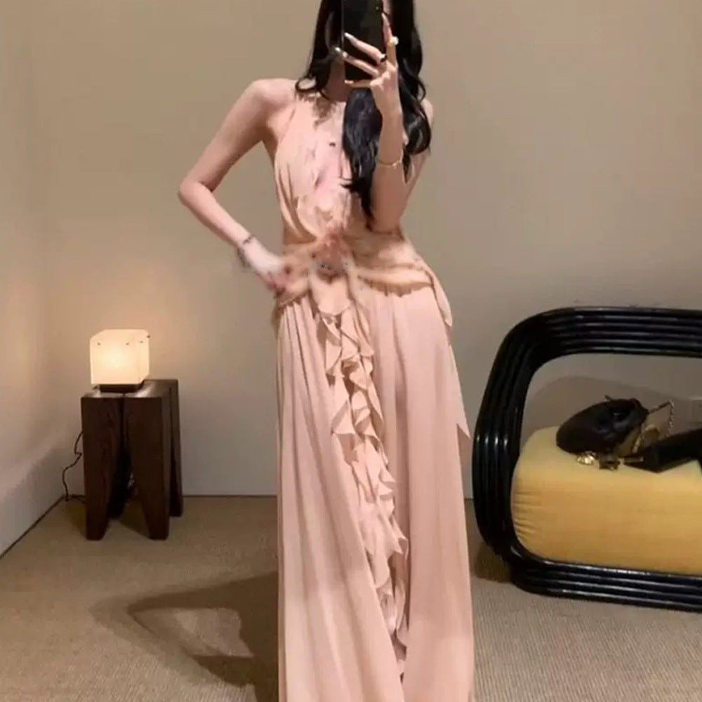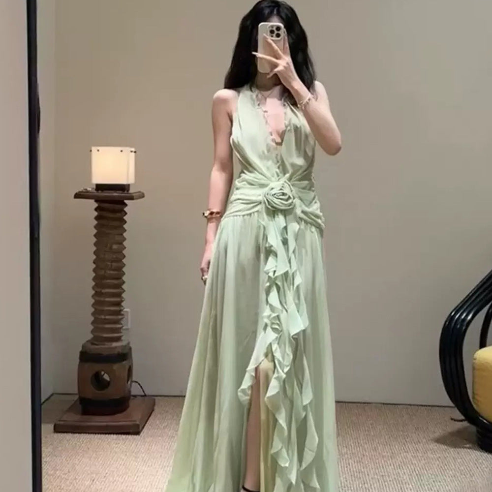 Plataz Sleeveless V-Necked Neck Dress With Wooden Ears Exposed Back Long Dress Beach Beach Seaside Holiday Dress
