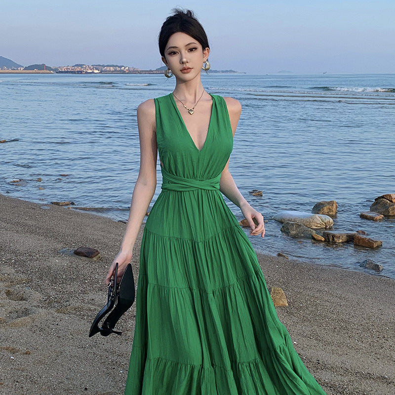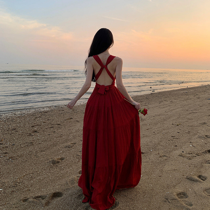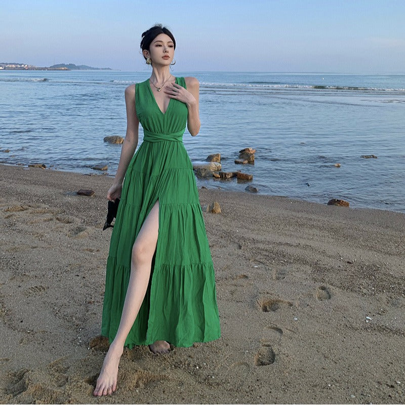Plataz V-Necked With Hanging Neck Dress Female Seaside Holiday Sexy Bare Back Open Fork Showing Lean Long Skirt