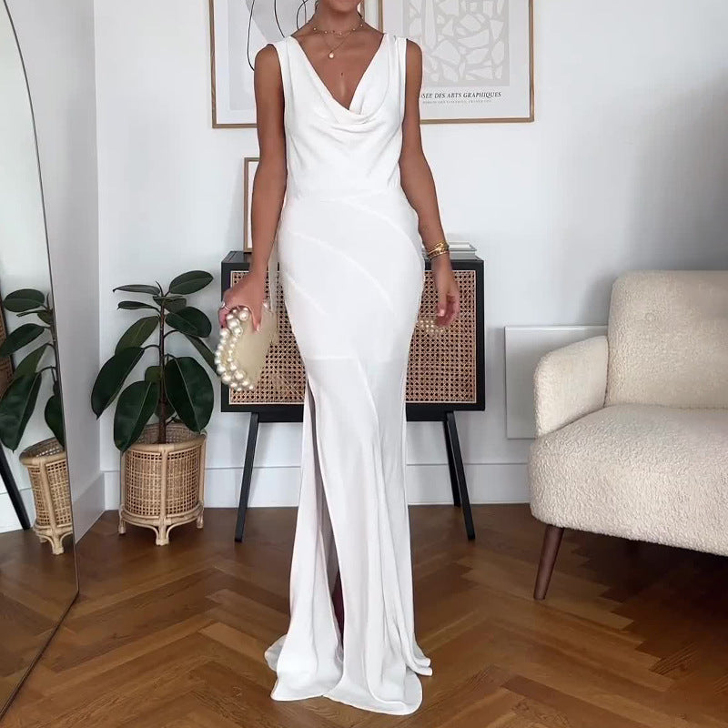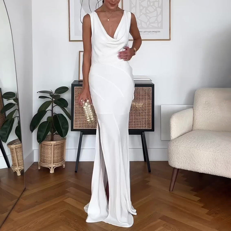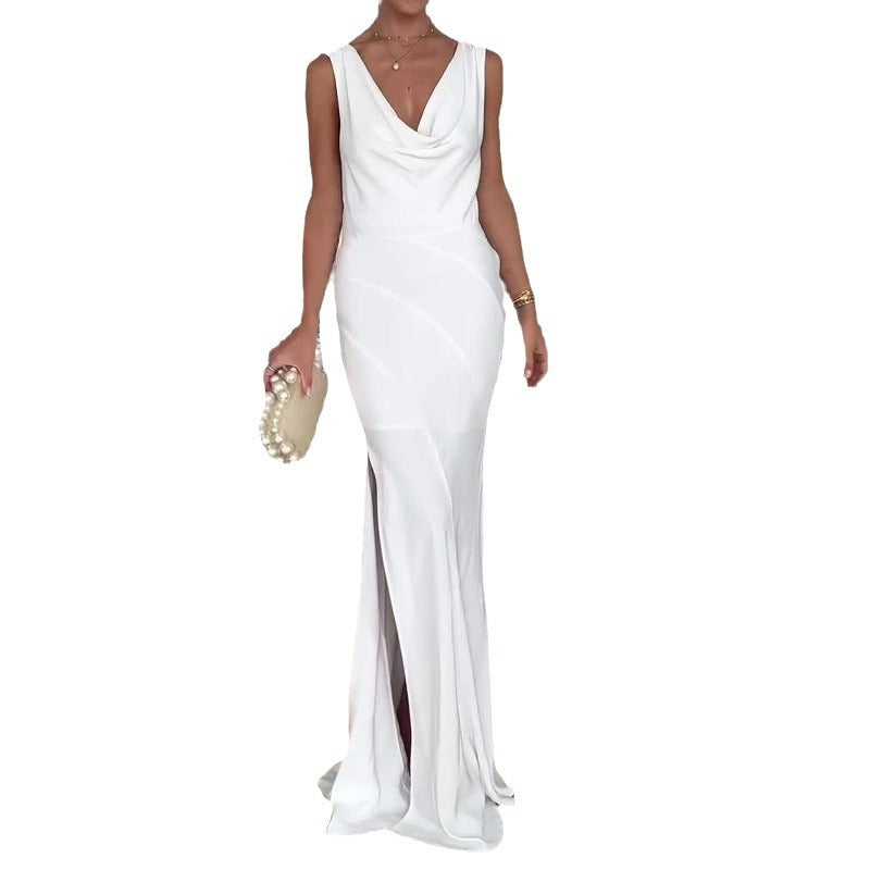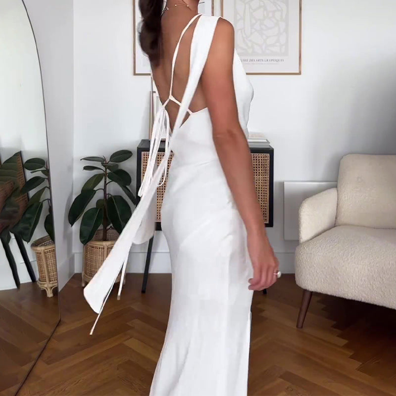 Plataz 2024 Women's Sexy Beach Wind Hanging Neck Deep V Bare Back Strap Long Textured White Dress