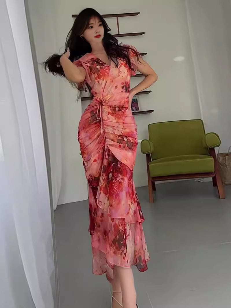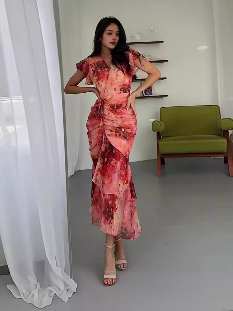 Plataz Thin Waist-Waisted French-Style Printed Bag Of Hip-Leaf Fishtail Dress