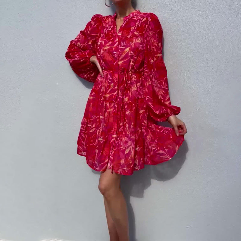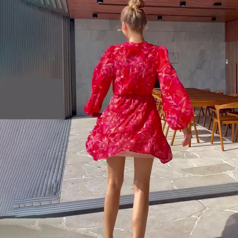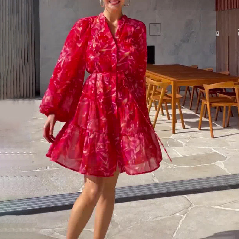 Plataz V-Neck Print Lantern Sleeve Chiffon High-Waisted Dress In Autumn 2024