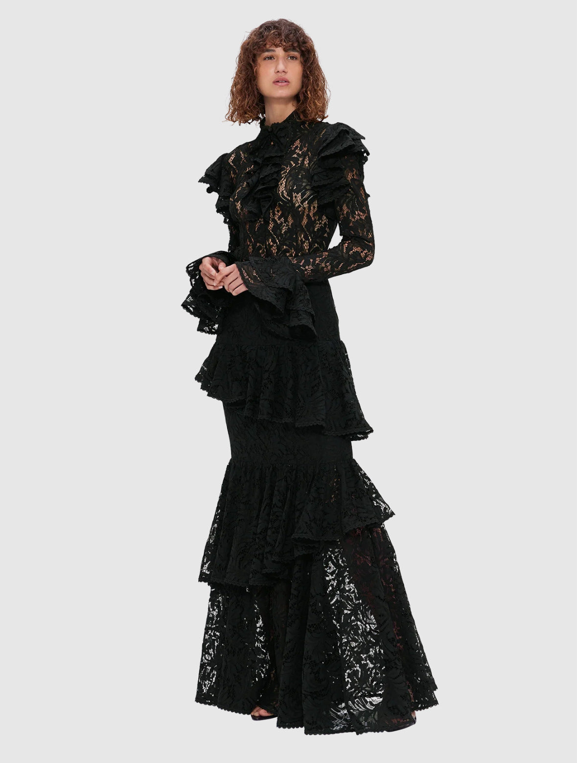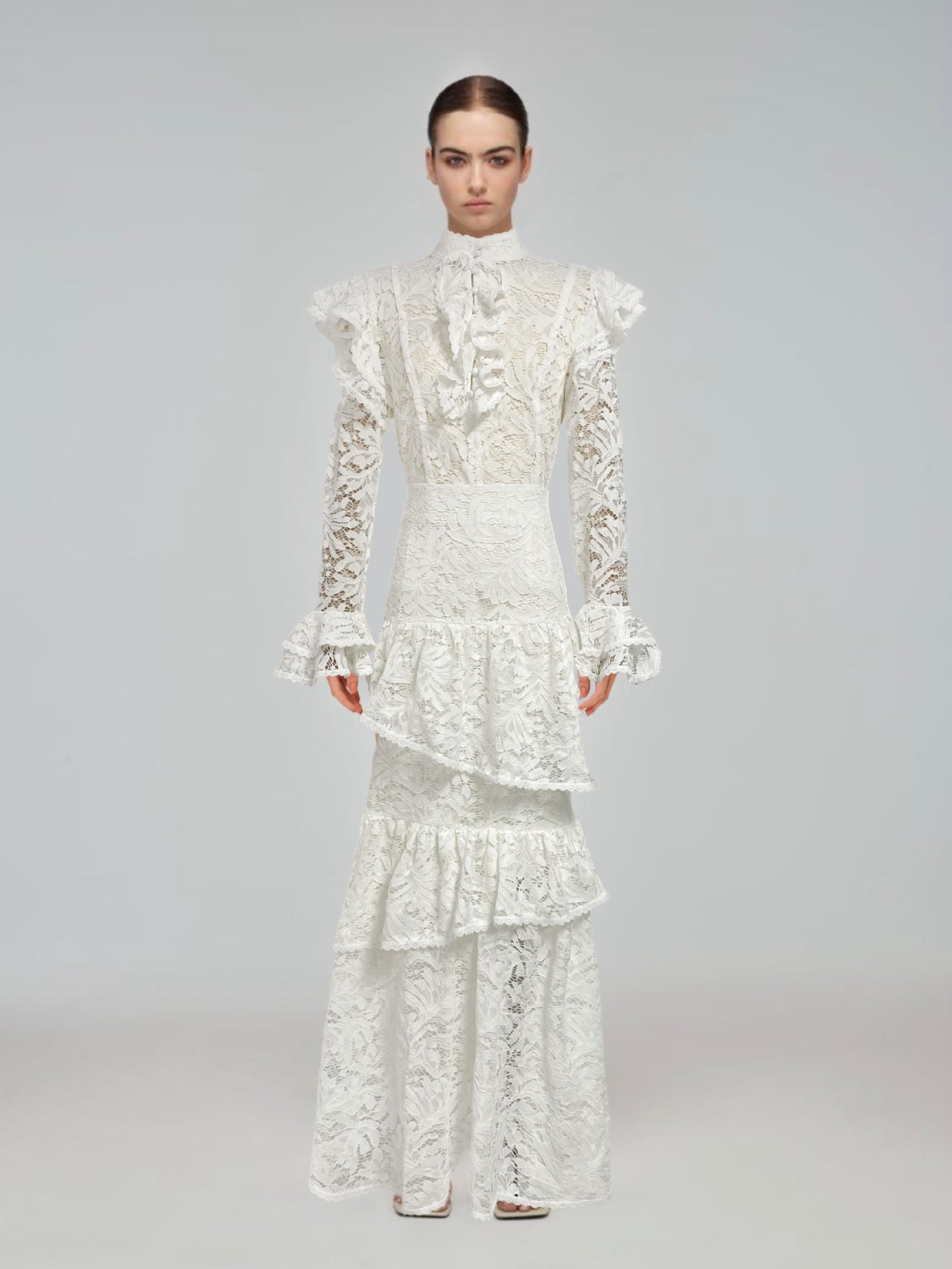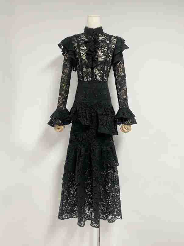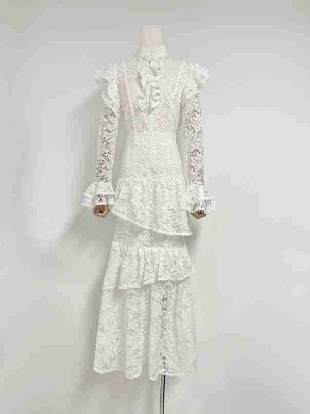 Plataz Summer New Collar Horn Long Sleeve With Waist Hollow Lace Dress Suit Woman