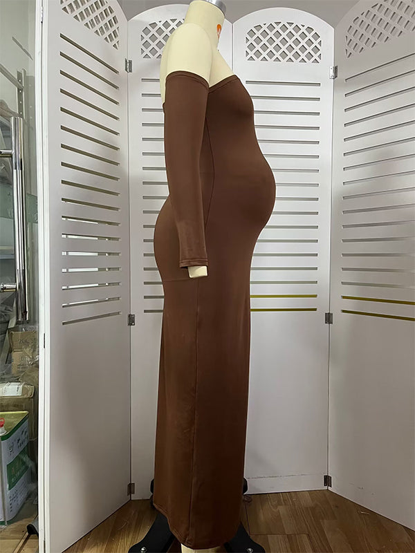 Plataz Brown Off Shoulder Long Sleeve Bodycon Elegant Going Out Maternity Photoshoot Baby Shower Party Maxi Dress Maternity