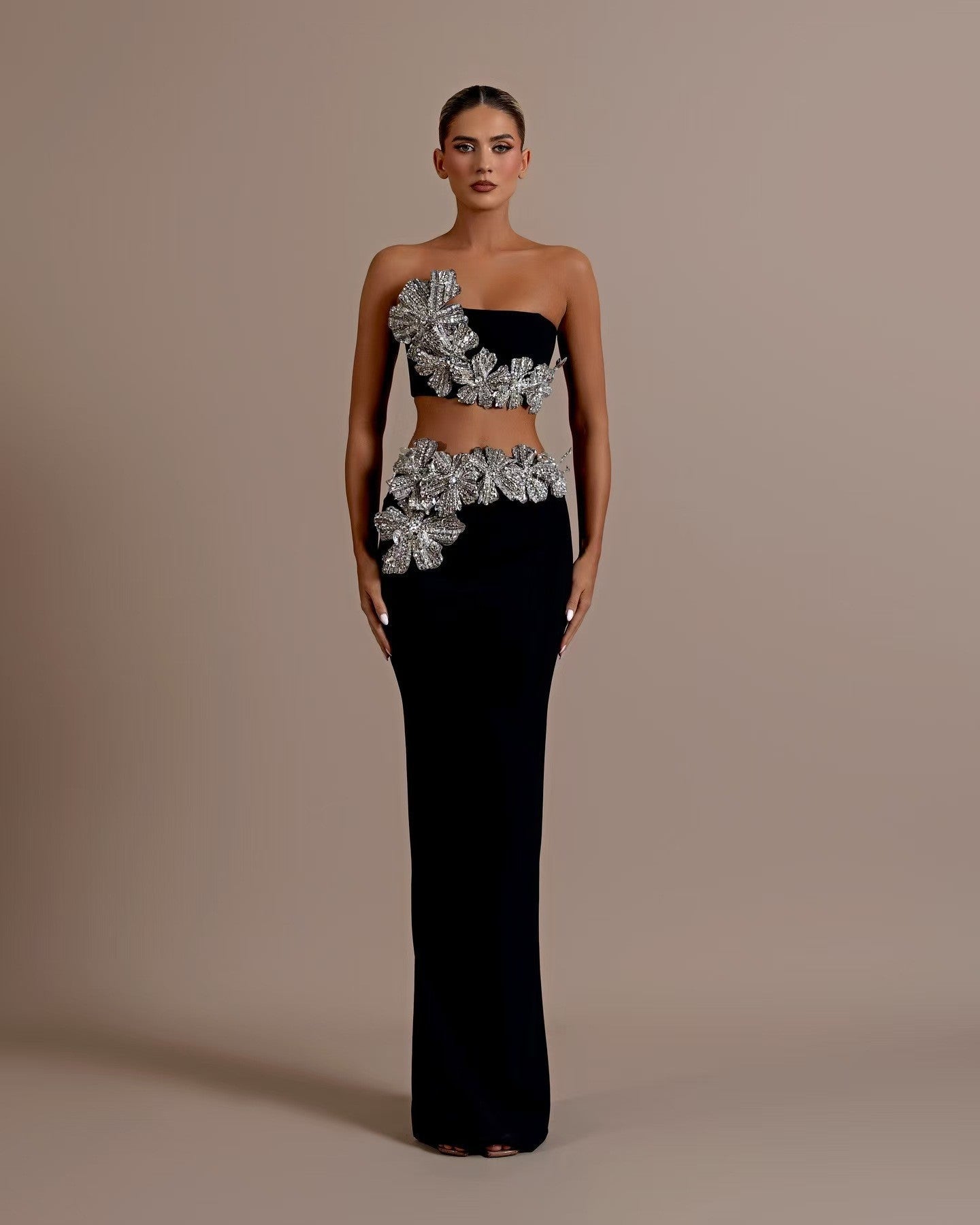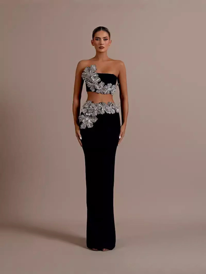 Plataz Fashion Heavy Industry Braided Flower Diamond Bag Bandage Long Skirt Party Two-Piece Dress