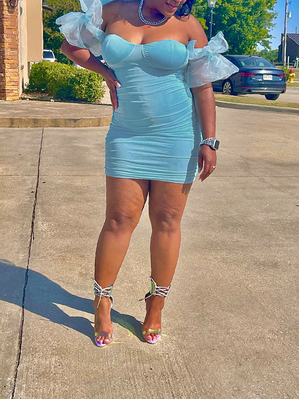Features:Bandeau, Solid Color, Mesh Sheer Patchwork, Mesh Long Sleeve, Open Back,Off Shoulder, Tulle Sleeves, Hip Skirt Fitted Bodycon Dress, Women Cute Bodycon Baby Shower Dress.See through mesh patchwork, Hip skirt fitted bodycon dress.