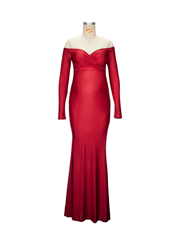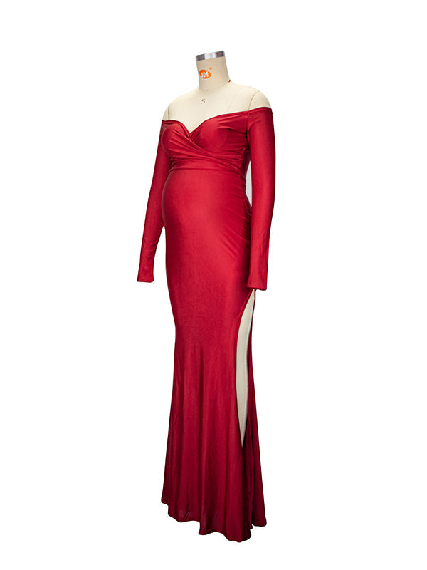 Plataz Off Shoulder Long Sleeve Slit Bodycon Solid Baby Shower Party Evening Gown Maternity Maxi Dress Maternity