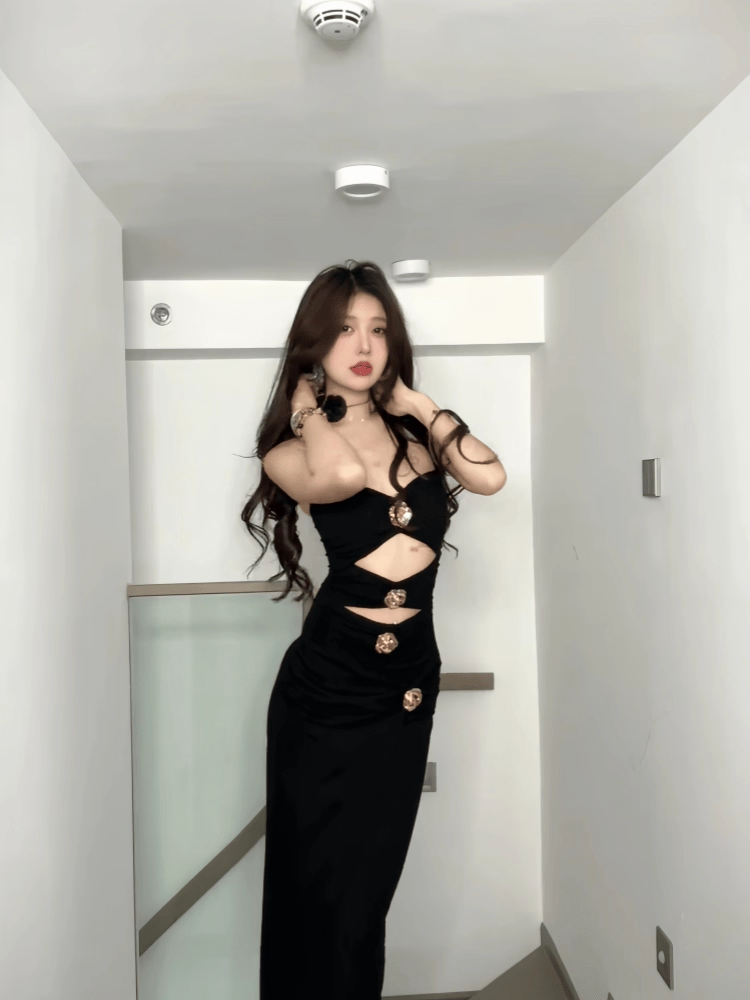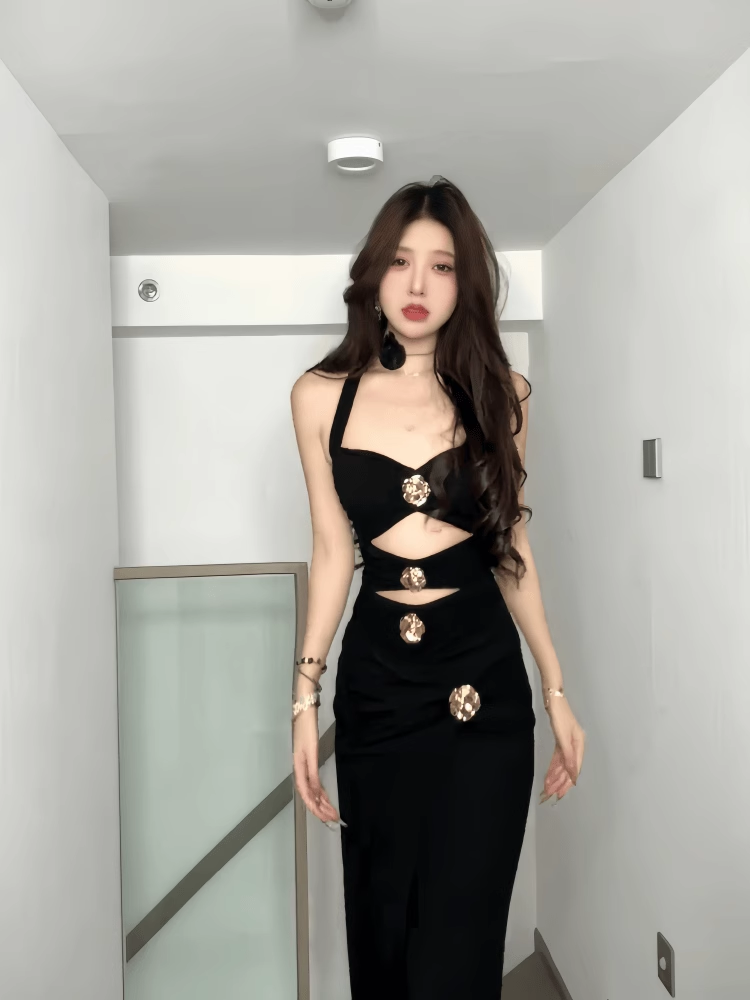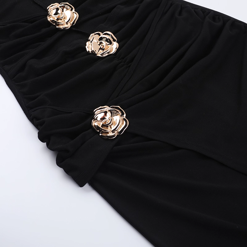 Elegant Black Halter-neck Rose Metal Button Prom Dress Sheath Evening Gown Party Dress Trailing Long Formal Dress HZ1024