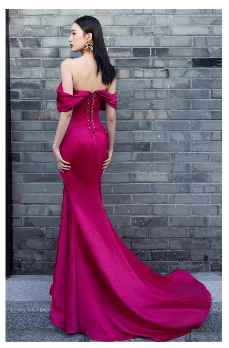 Elegant Hot Pink Off-the-shoulder Prom Dress Satin Evening Gown Mermaid Party Dress Trailing Long Formal Dress HZ1024