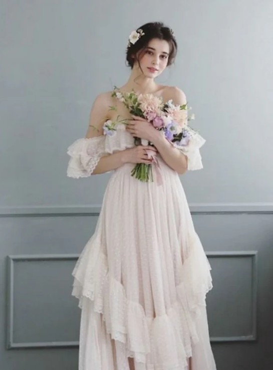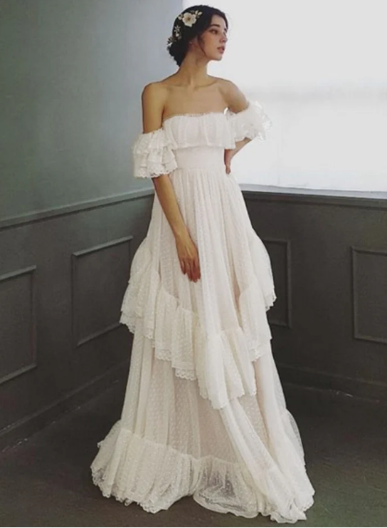 Elegant Ivory Lace Off-the-shoulder A-Line Tiered Wedding Dress HZ1024