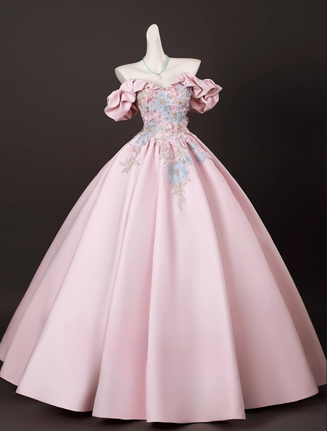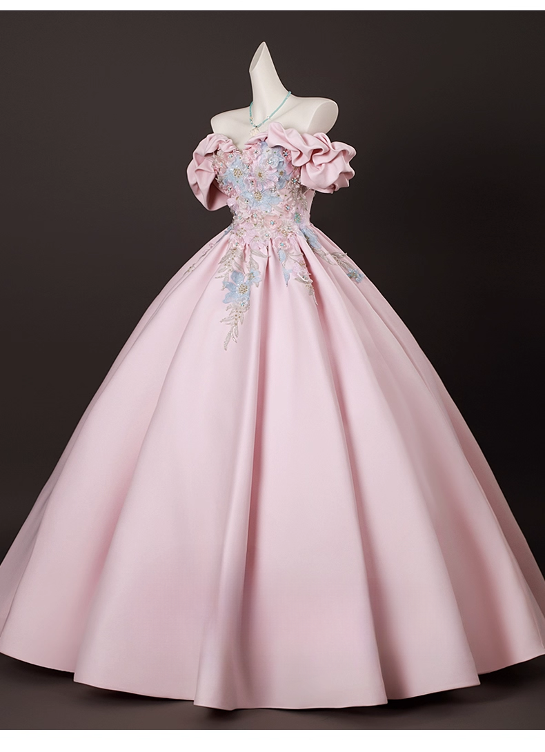 Elegant Pink Satin Applique Sweet 16 Quinceanera A-Line Off-the-shoulder Evening Dress Long Ball Gown HZ1024