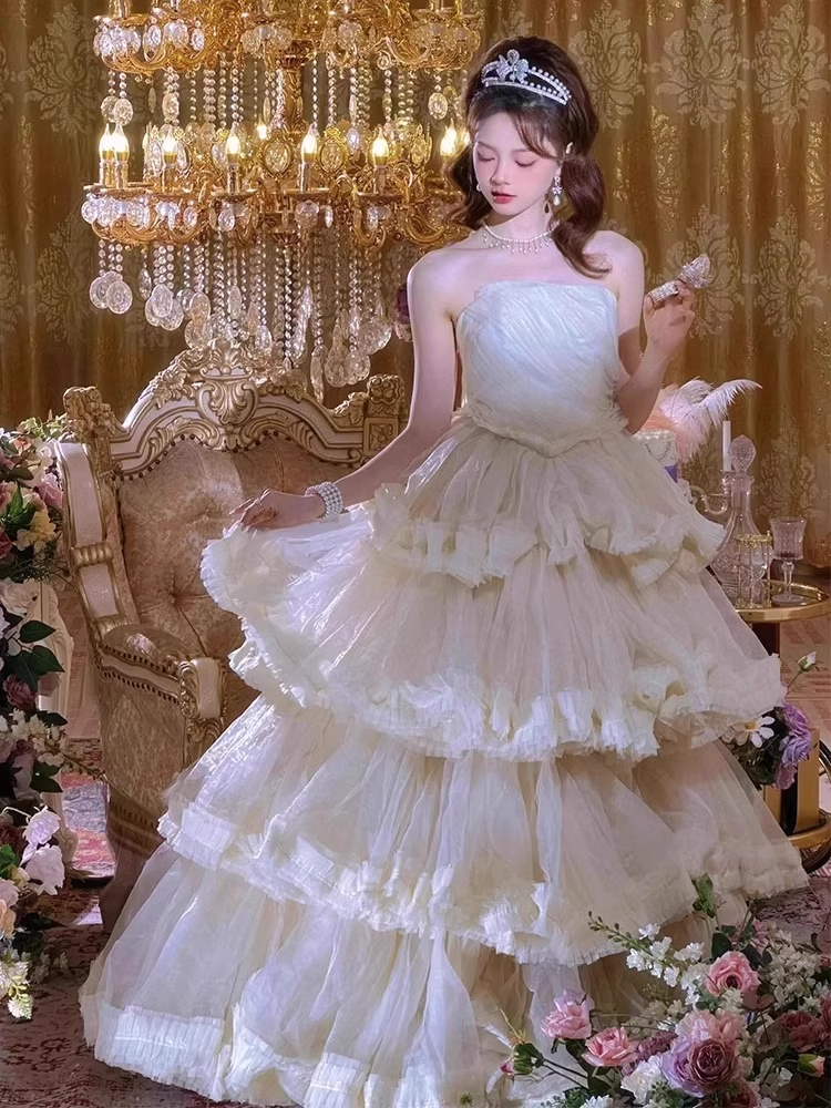 Elegant White Strapless Tiered Sweet 16 Quinceanera A-Line Tulle Evening Dress Ball Gown HZ1024