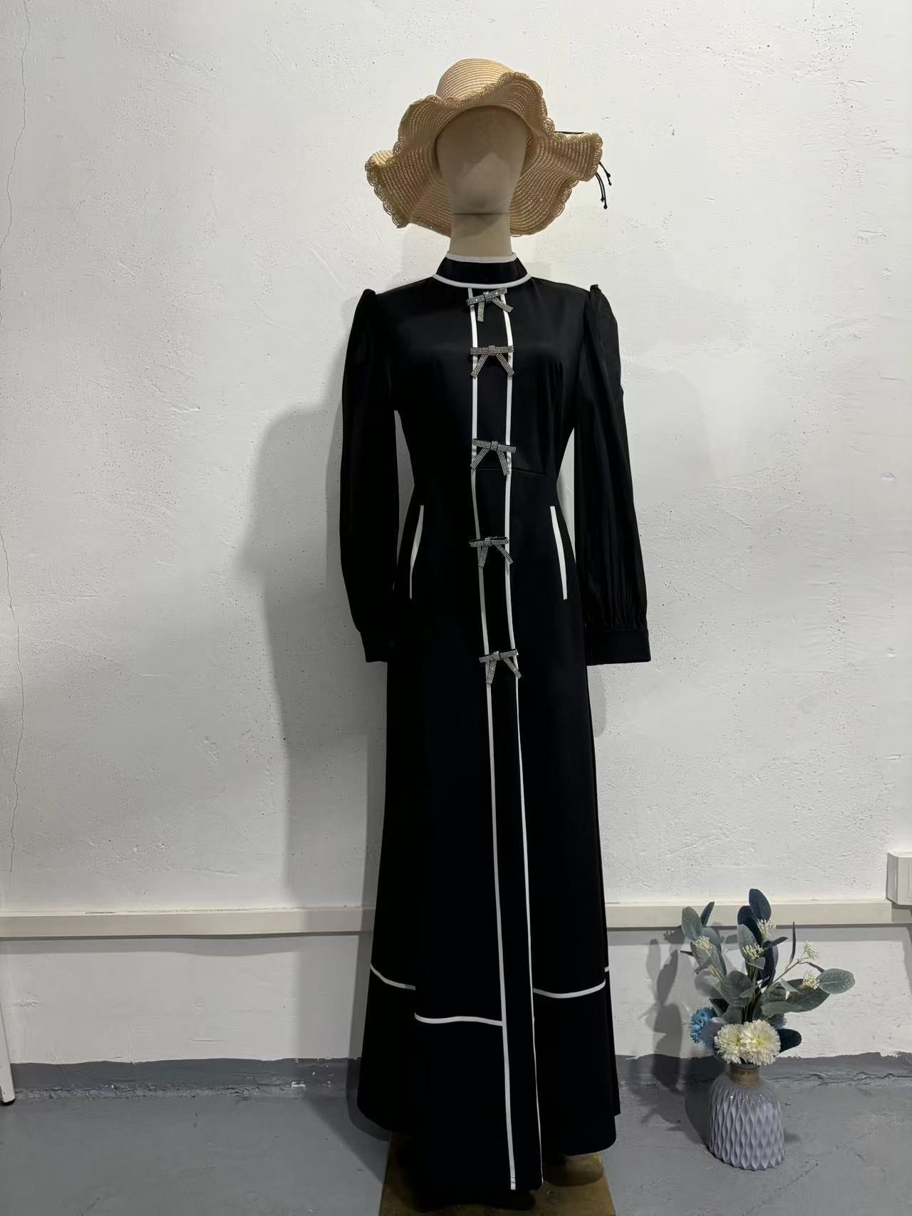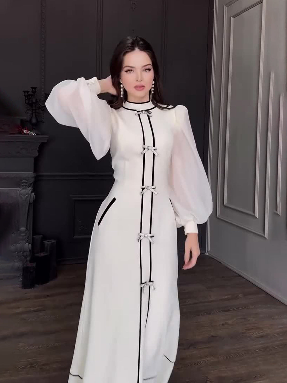 Plataz 2024 New Bow Decoration Black And White Splicing Temperament Half-High Collar Long Dress