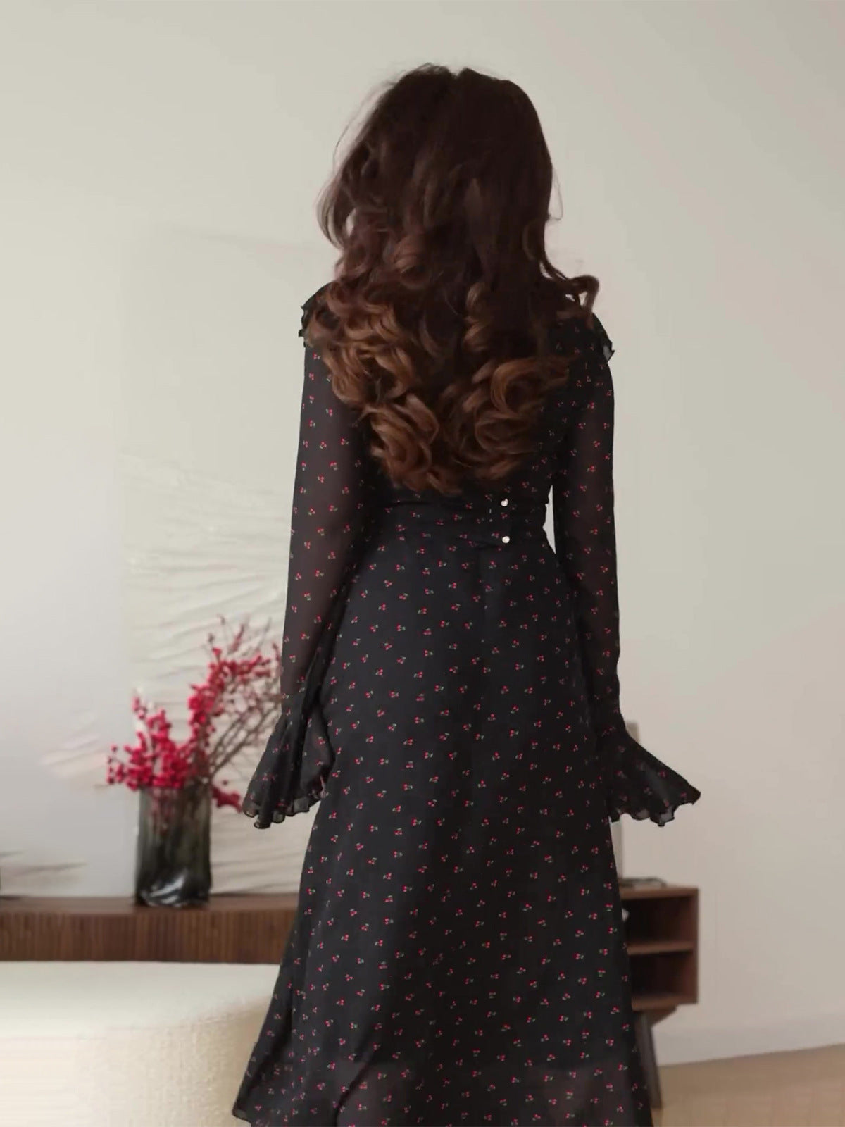 Plataz 2024 New Chiffon-Print Lotus Leaf Sleeve Temperament Long V-Neck Long Dress