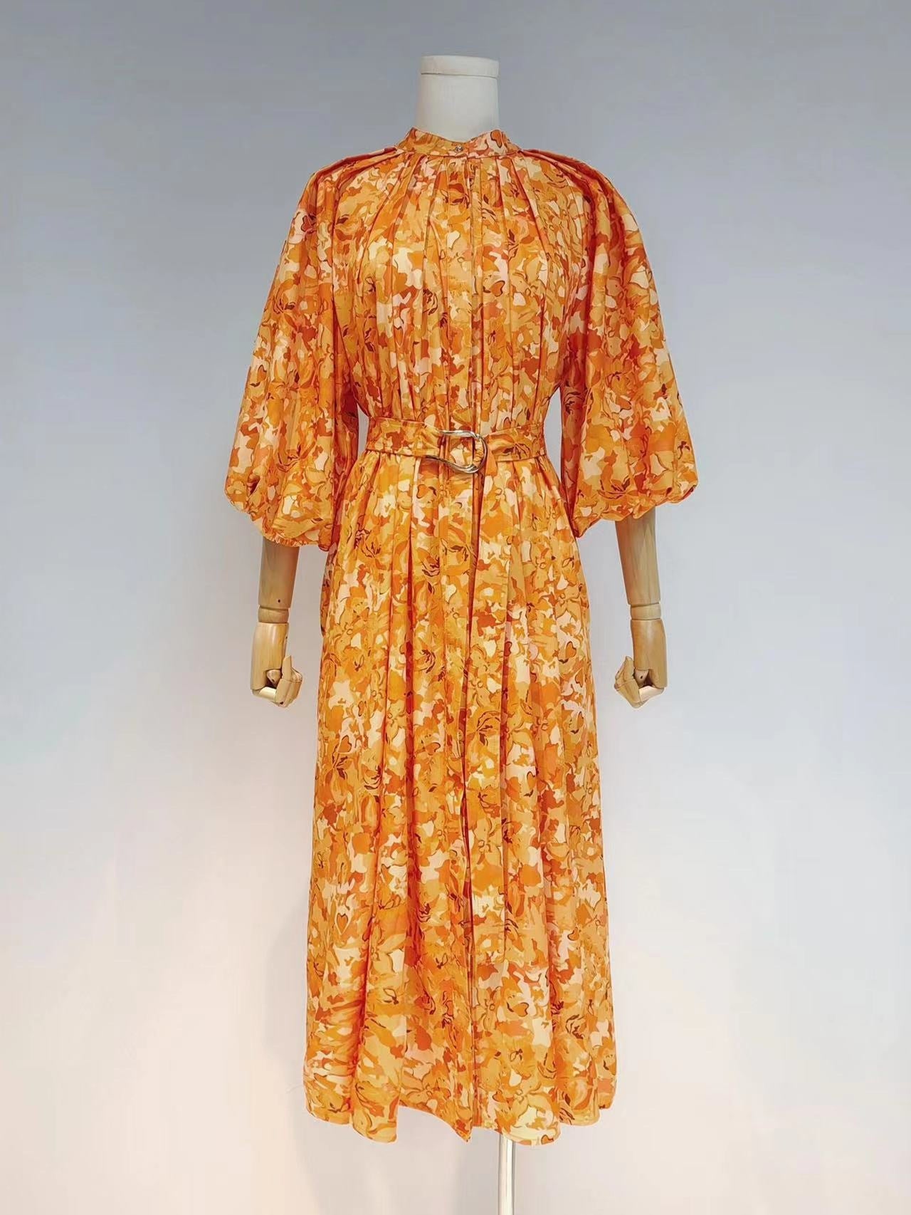 Plataz 2024 New Collar Lantern Sleeve Single Buckle Belt To Collect Waist Long Dress Dress Woman