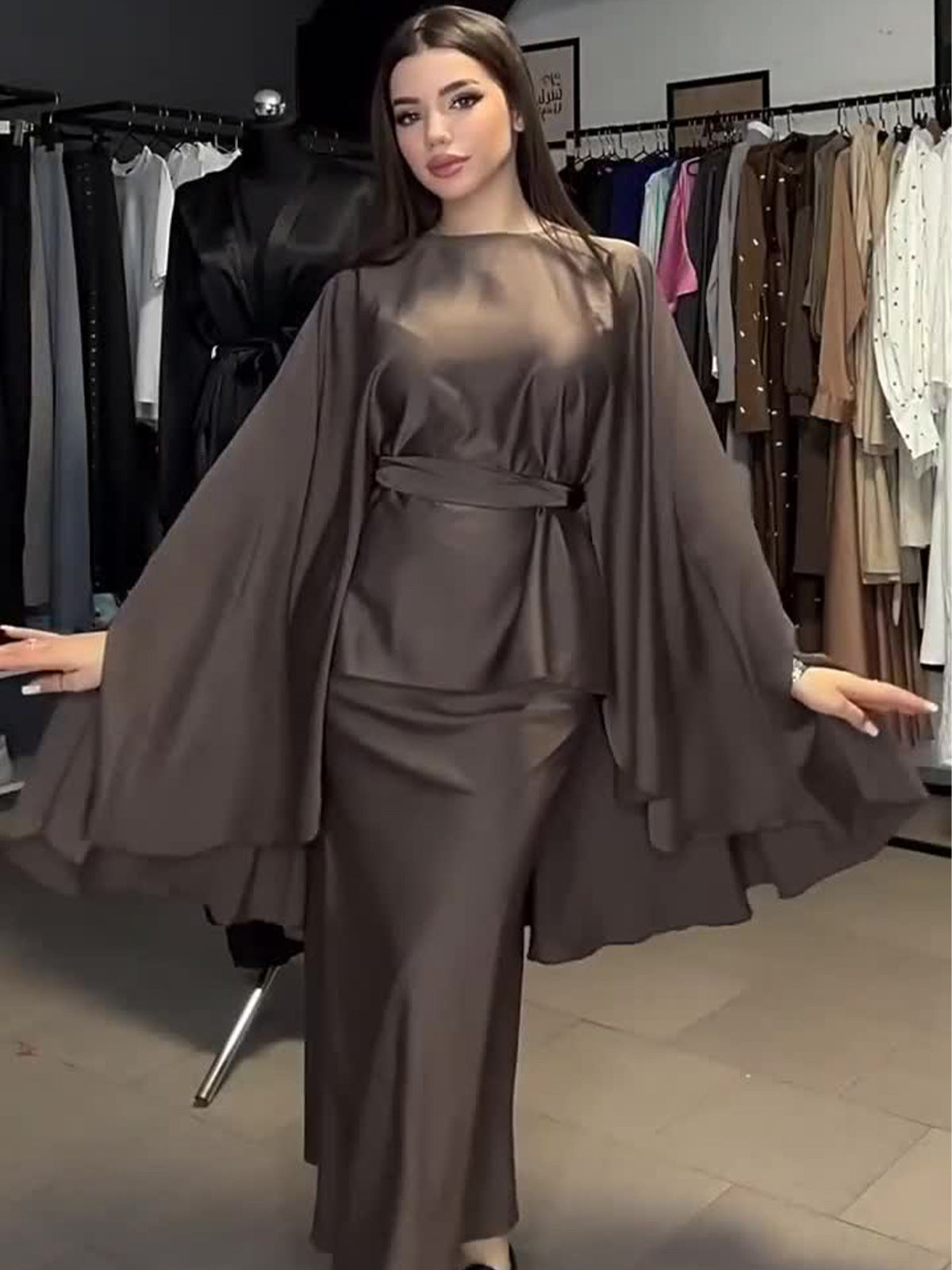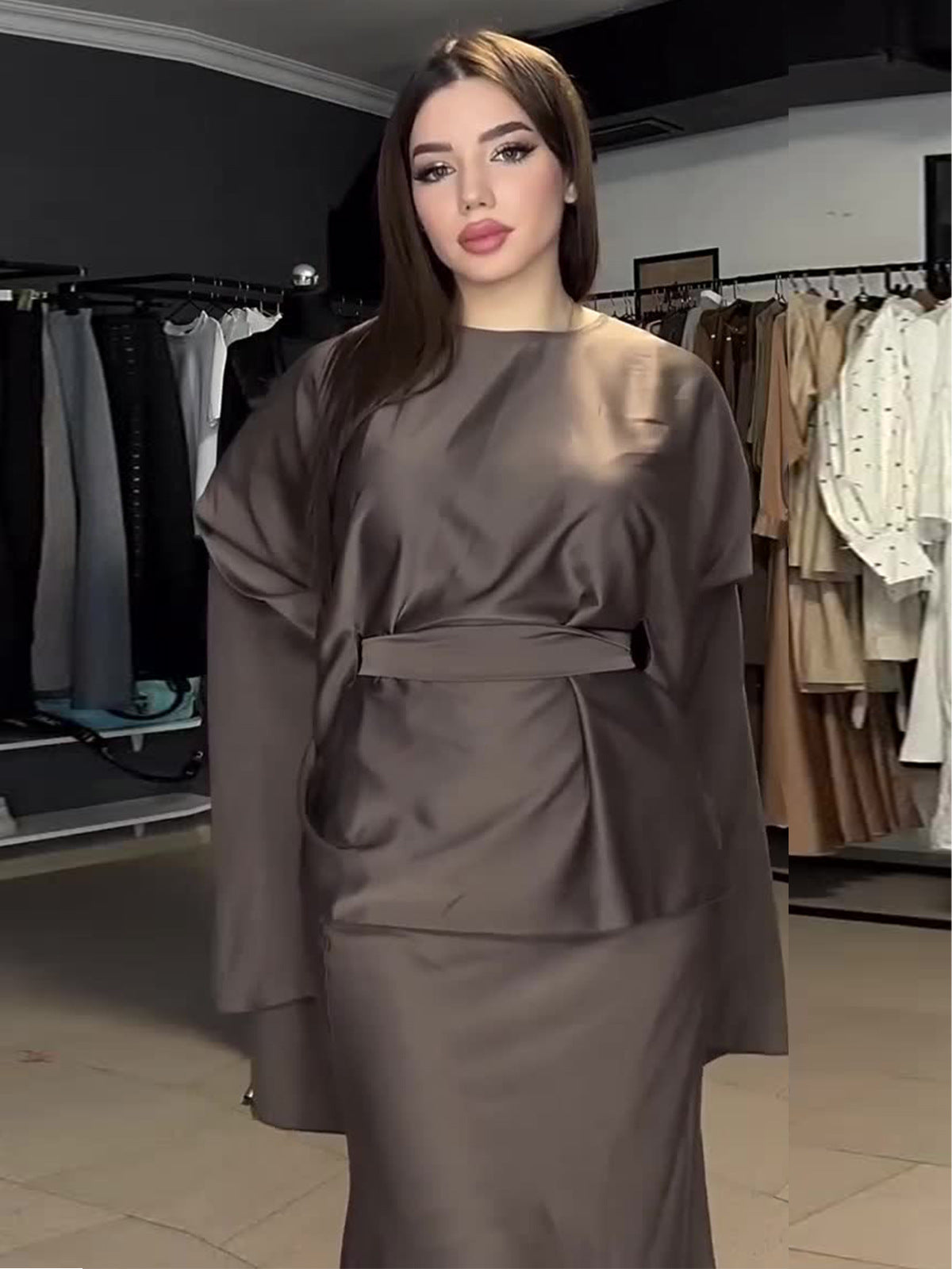 Plataz 2024 New Round-Neck Long-Sleeved Dress Bat Sleeve With Waist-Hanging-Sense-Sensed-Sense-Sensed Set