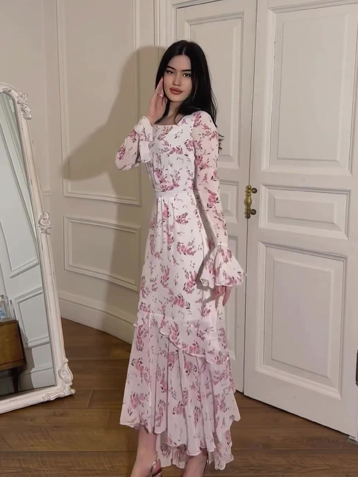 Plataz 2024 Summer Chiffon Flower Leaf Sleeves Long-Sleeves Illustuff Irregular Dress