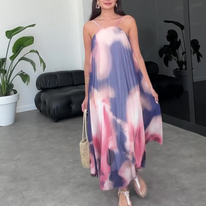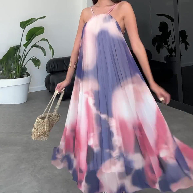 Plataz 2024 Women's Sling Tie-Dye Purple Print Loose-Back Sexy Dress