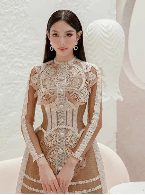 Plataz 2025 Lace Water-Soluble Flower Hollow Dress Long Sleeve Brown Short Skirt