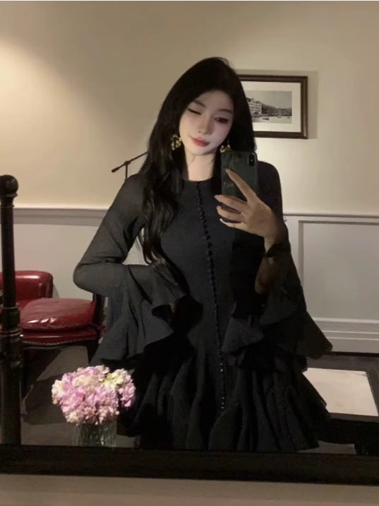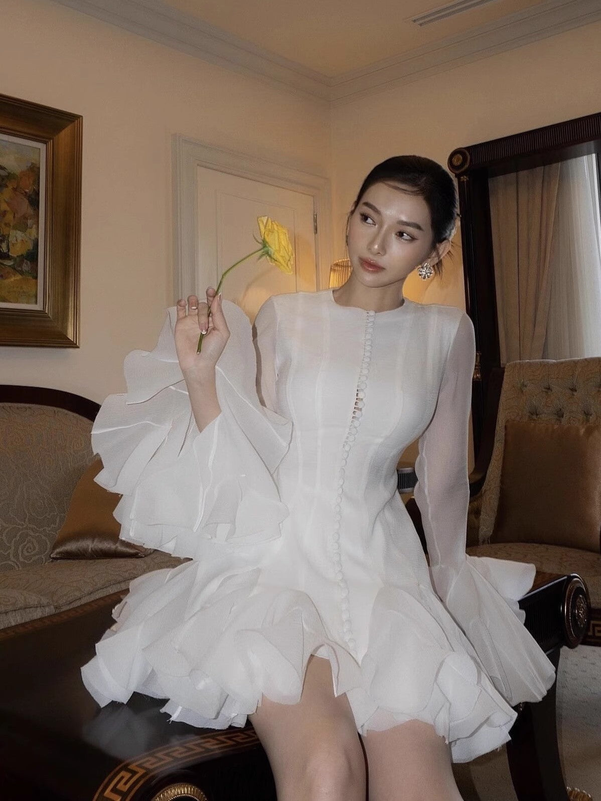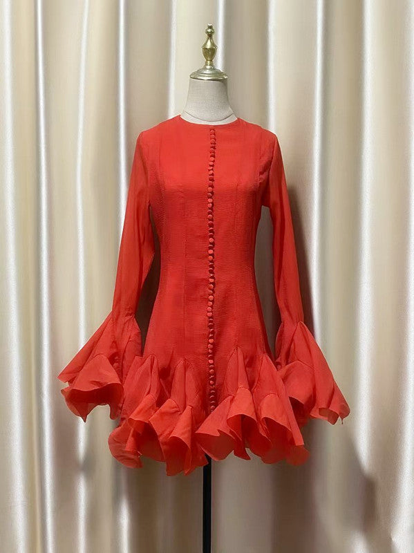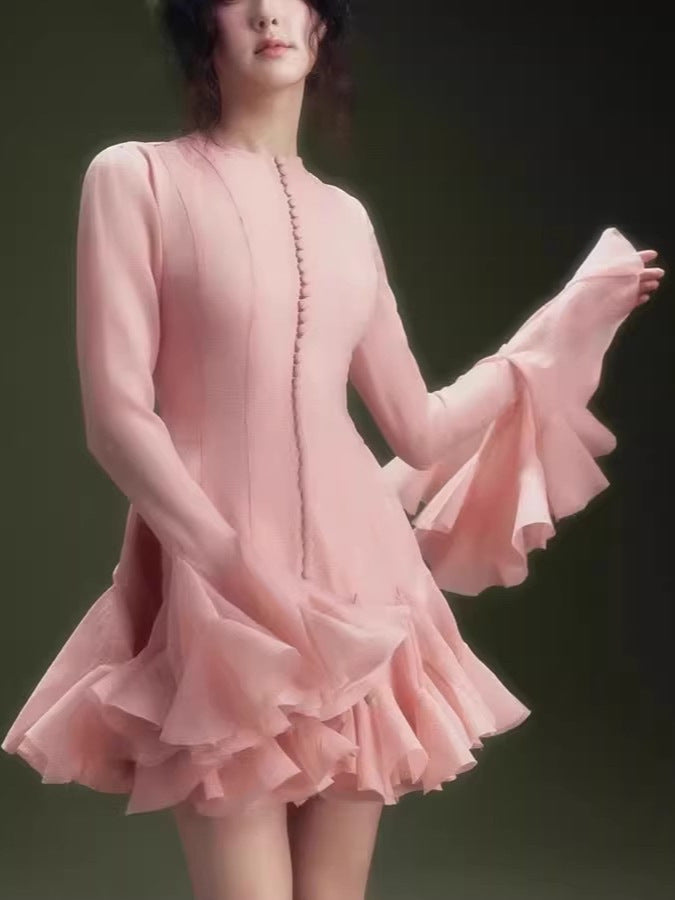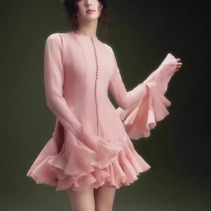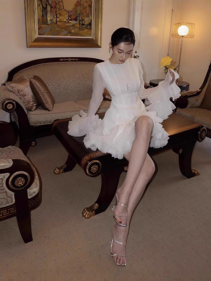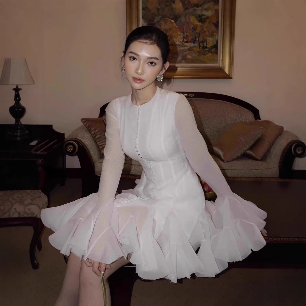Plataz 2025 Long-Sleeved Dating Dress Lotus Edge Cut Dress White Short Dress