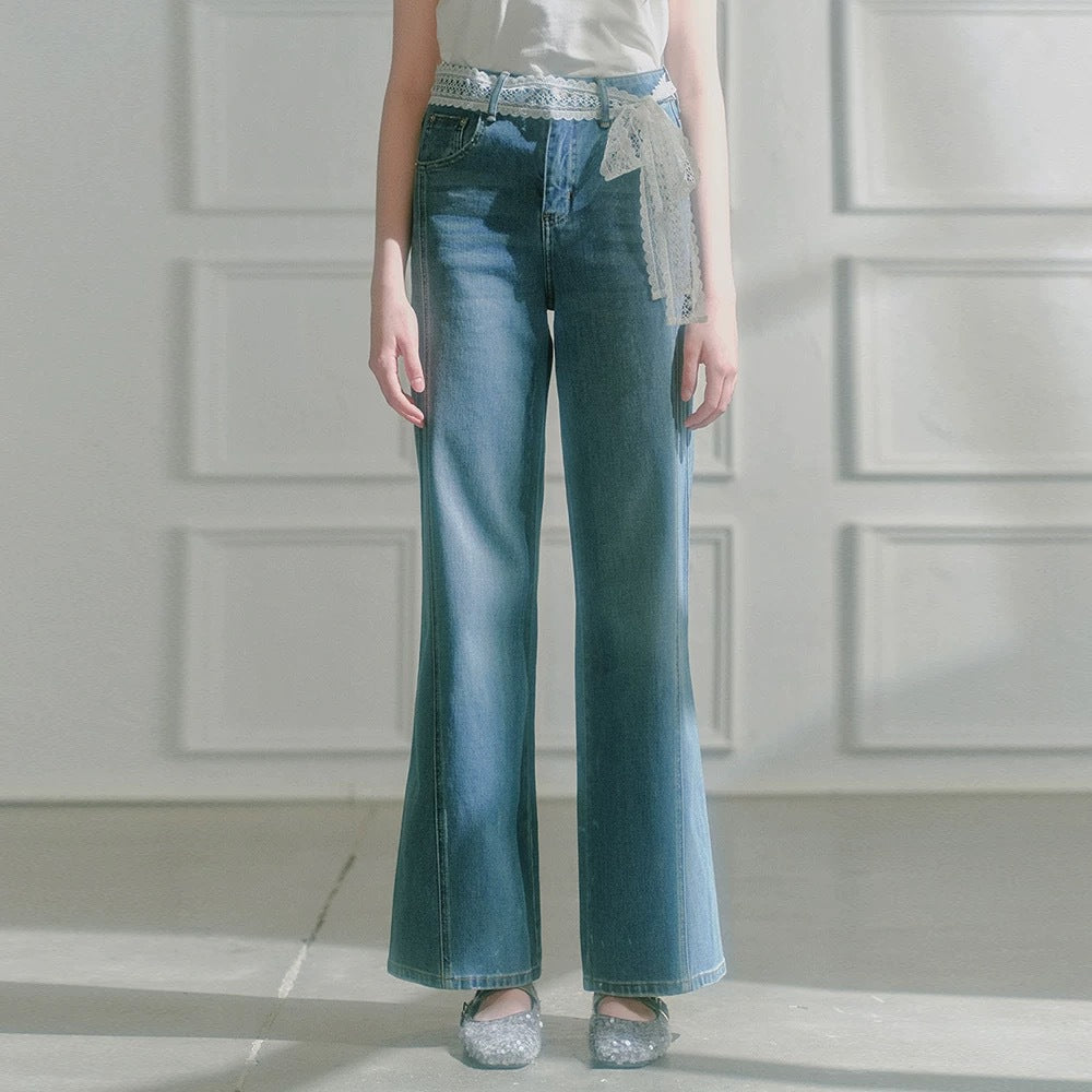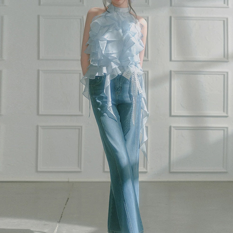 Plataz 2025 Spring And Summer Ice Blue Wave Ribbon Lace Strapped Clothes