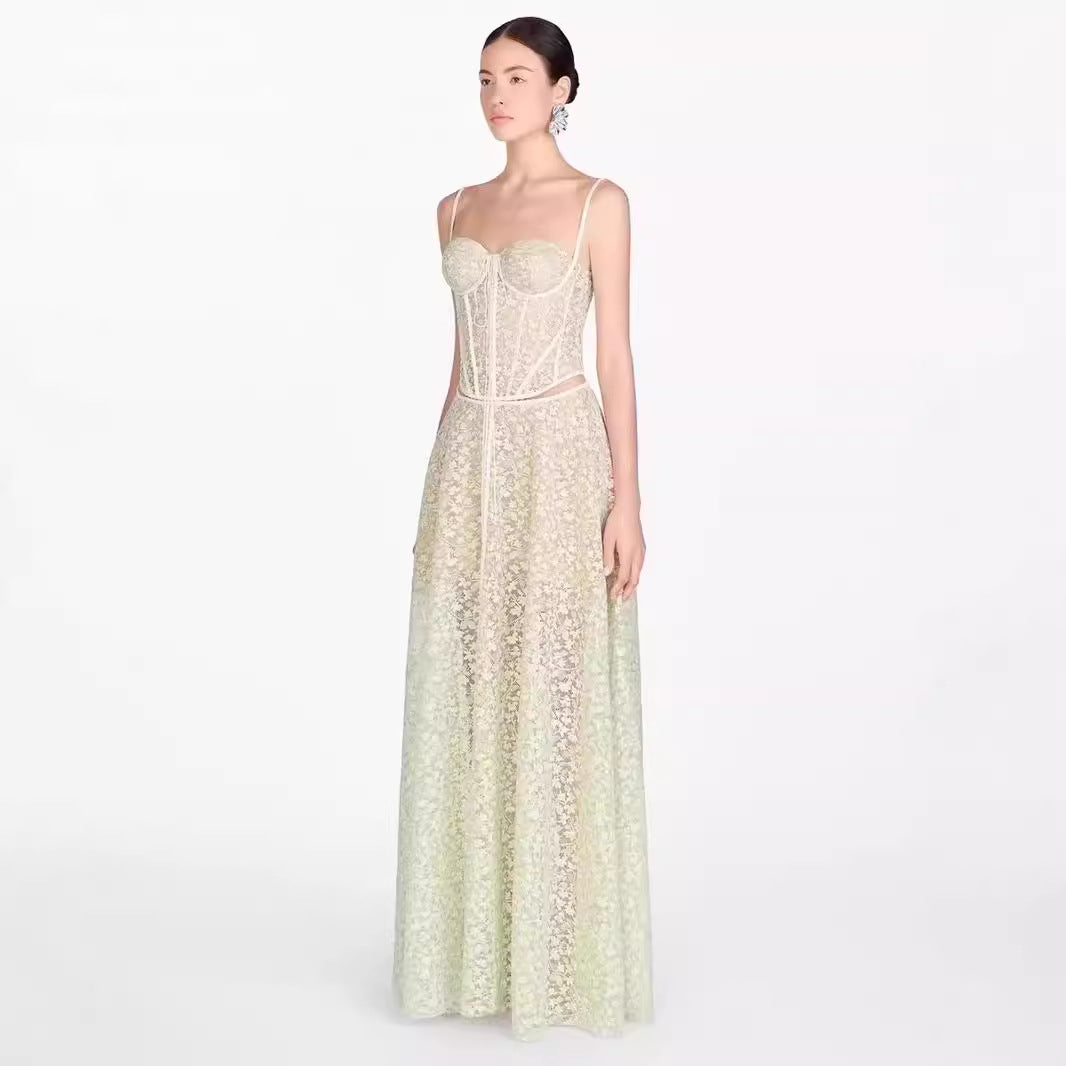 Plataz 2025 Summer Lace Splicing Hollow Open Fork Slings Tsets Dress Woman