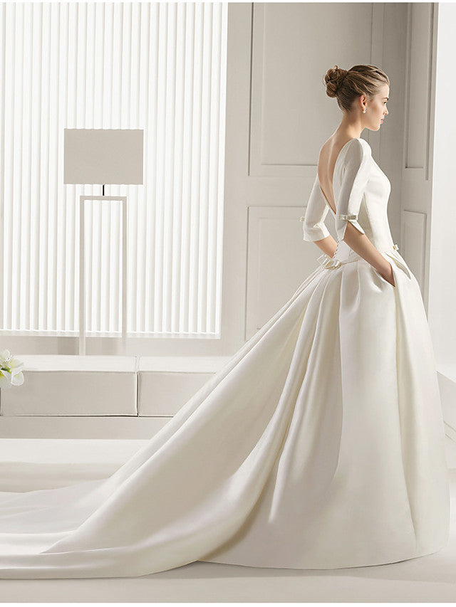 Plataz A-Line Bateau Neck Polyester Half Sleeve Backless Wedding Dresses with HZ1007
