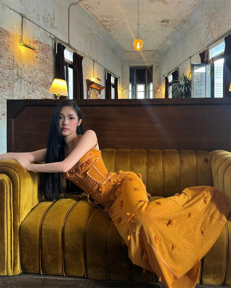 Plataz And Summer 2025 New Female Vietnamese Small Fish Bone Sling Net Yarn Dress To Collect Waist Thin Flower Dress Dress