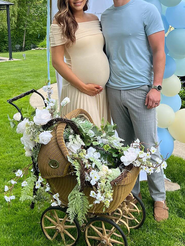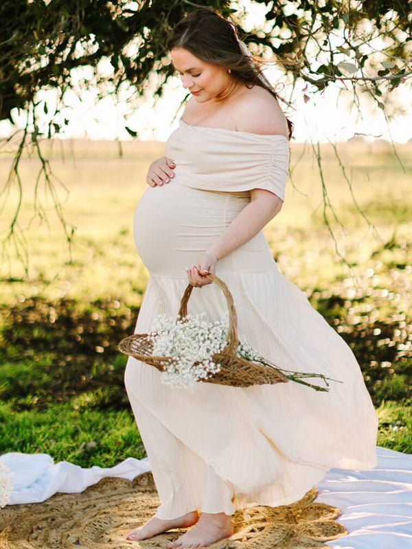 Plataz Apricot Off Shoulder Ruched Pleated Big Swing Maternity Baby Shower Maxi Dress Maternity