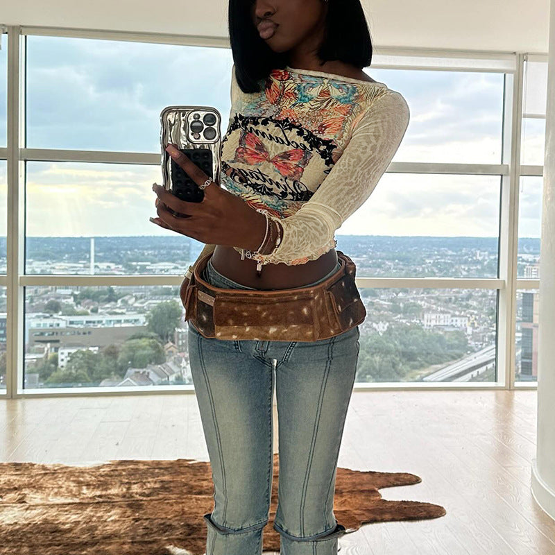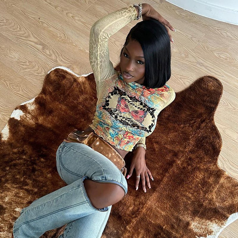 Plataz Autumn 2025 New Women's Clothing Vintage Quality-Renovined Print Mesh T-Shirt Woman DJPT