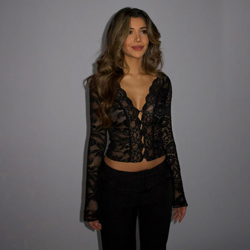 Plataz Autumn 2025 New Women's Dresses Sexy Vicaric V-Necked Lace Long Sleeve Blouse DJPT