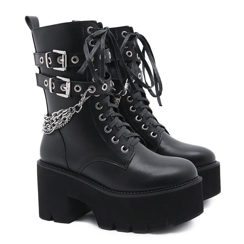 Plataz Autumn And Winter New Thick Side Zipper Thick Background Fashion Rivet Belt Buckle Girl Chain Martin Boots High Quality Shoes
