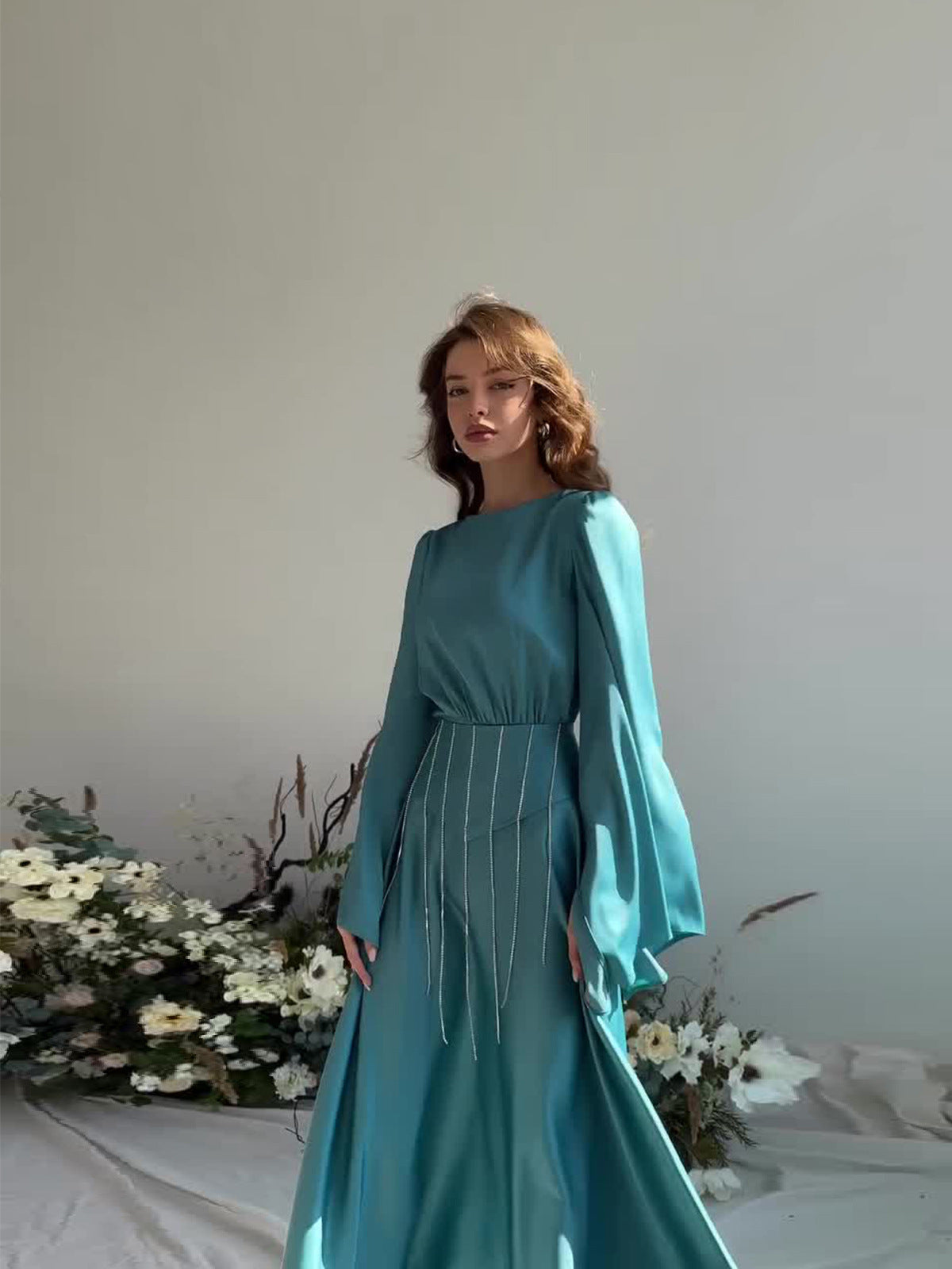 Plataz Autumn New Strap-In-String Diamond Collection Waist Thin Horn Sleeves Big Name Dress