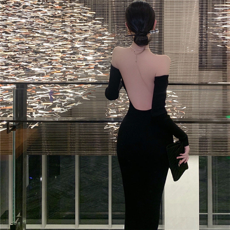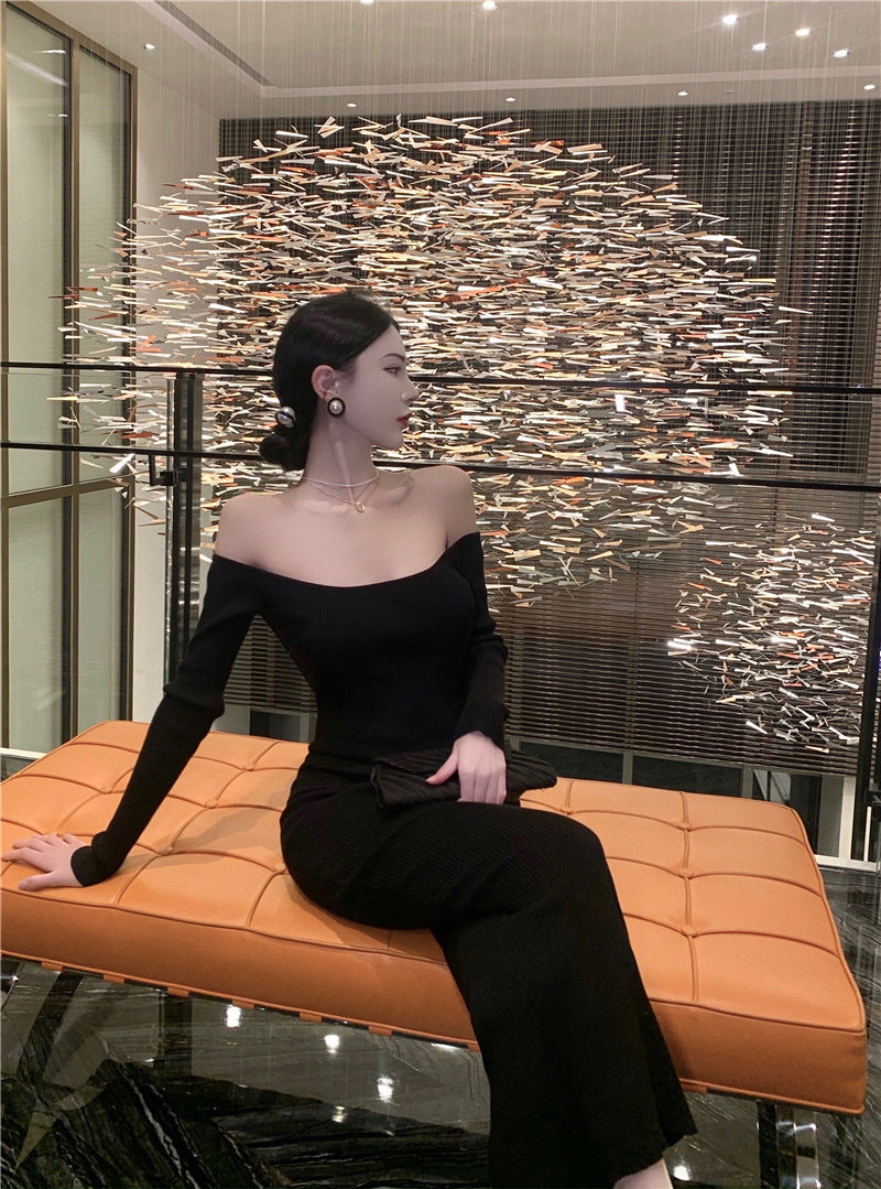 Plataz Big Show Back Black Brooch Knitted Dress High-End Famous Temperament Pure Shoulder Dress Dress