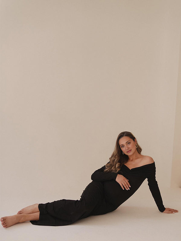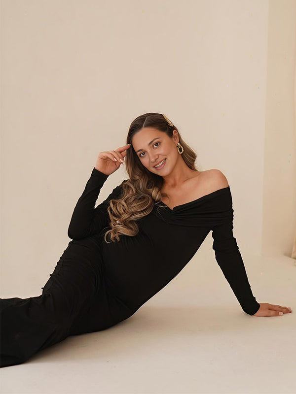 Plataz Black Off Shoulder Ruched Bodycon Elegant Photoshoot Baby Shower Maternity Maxi Dress Maternity