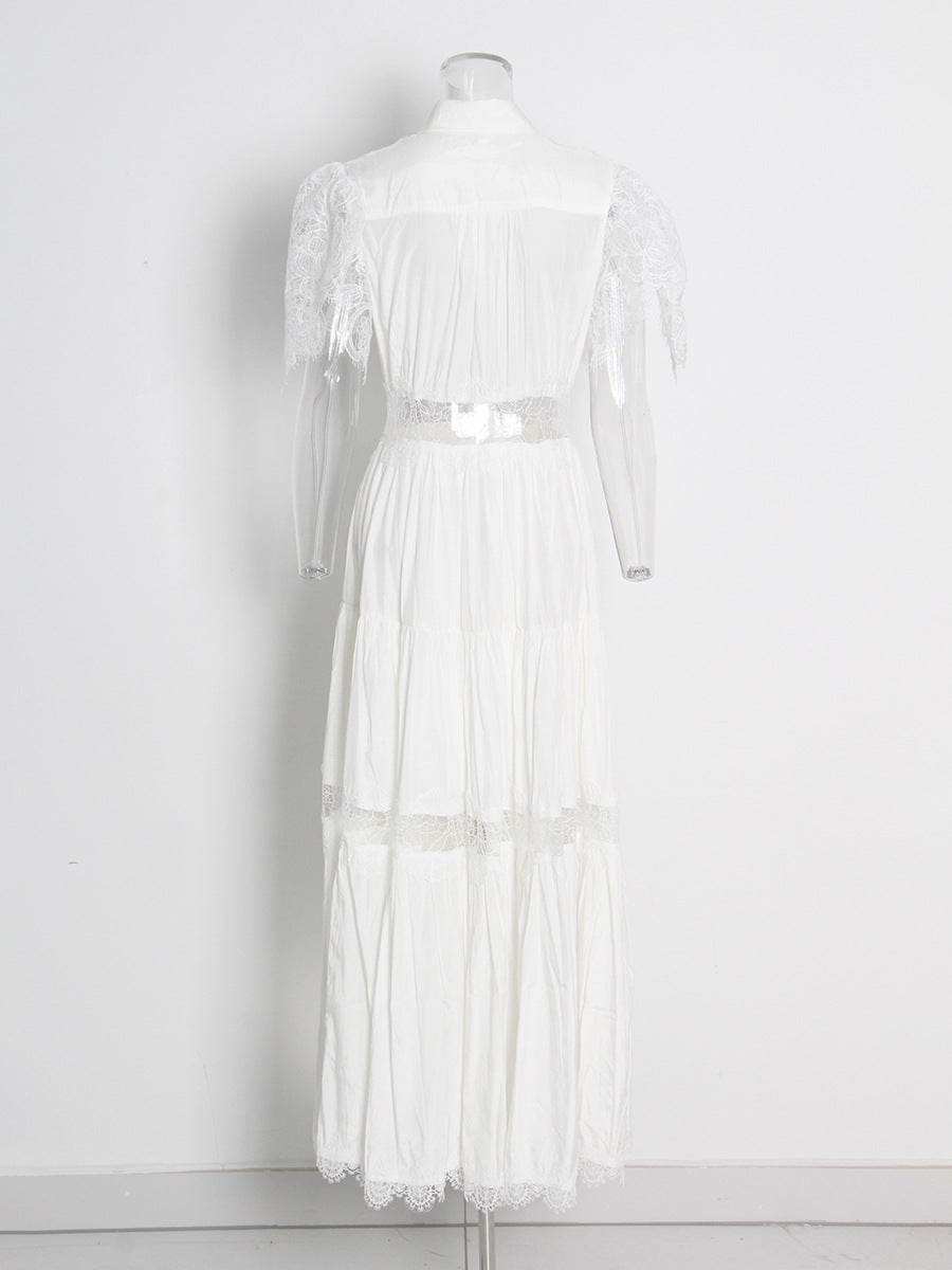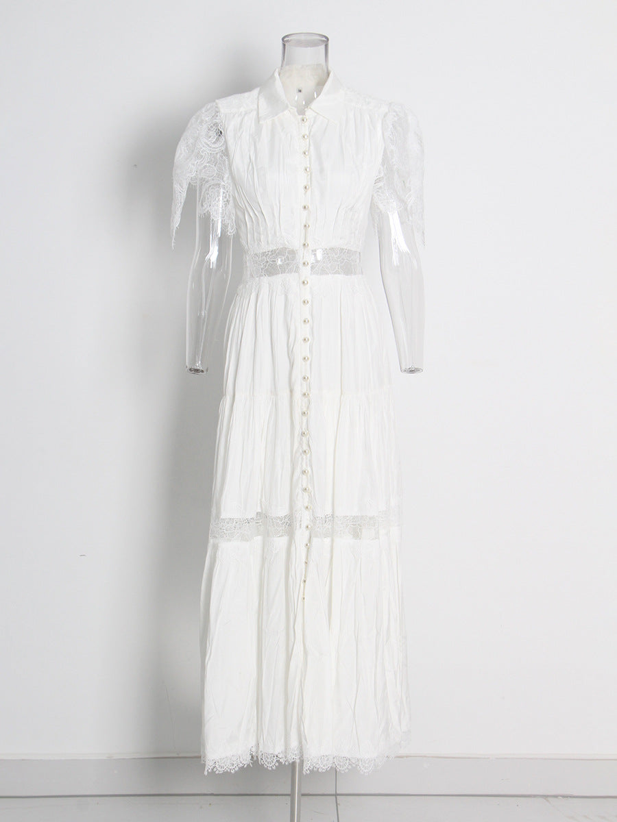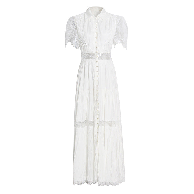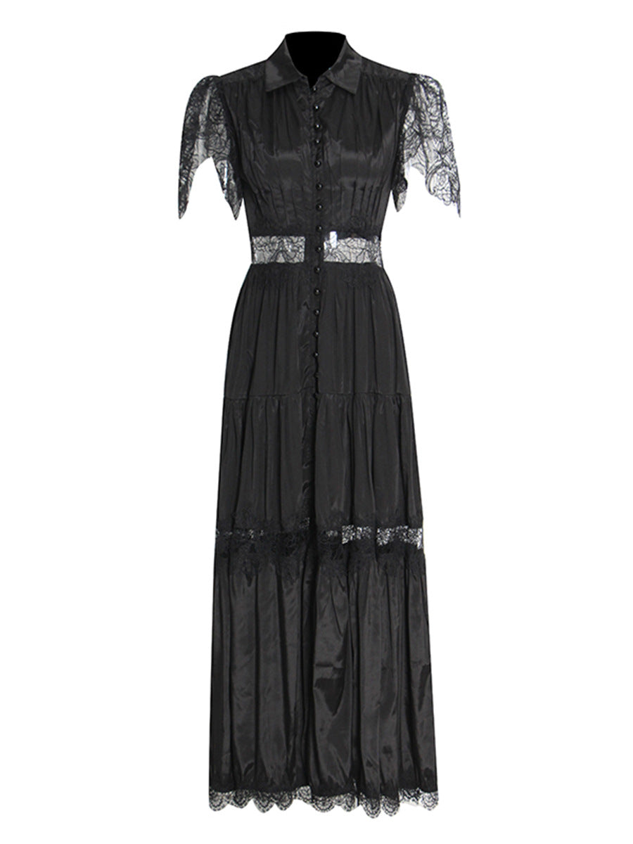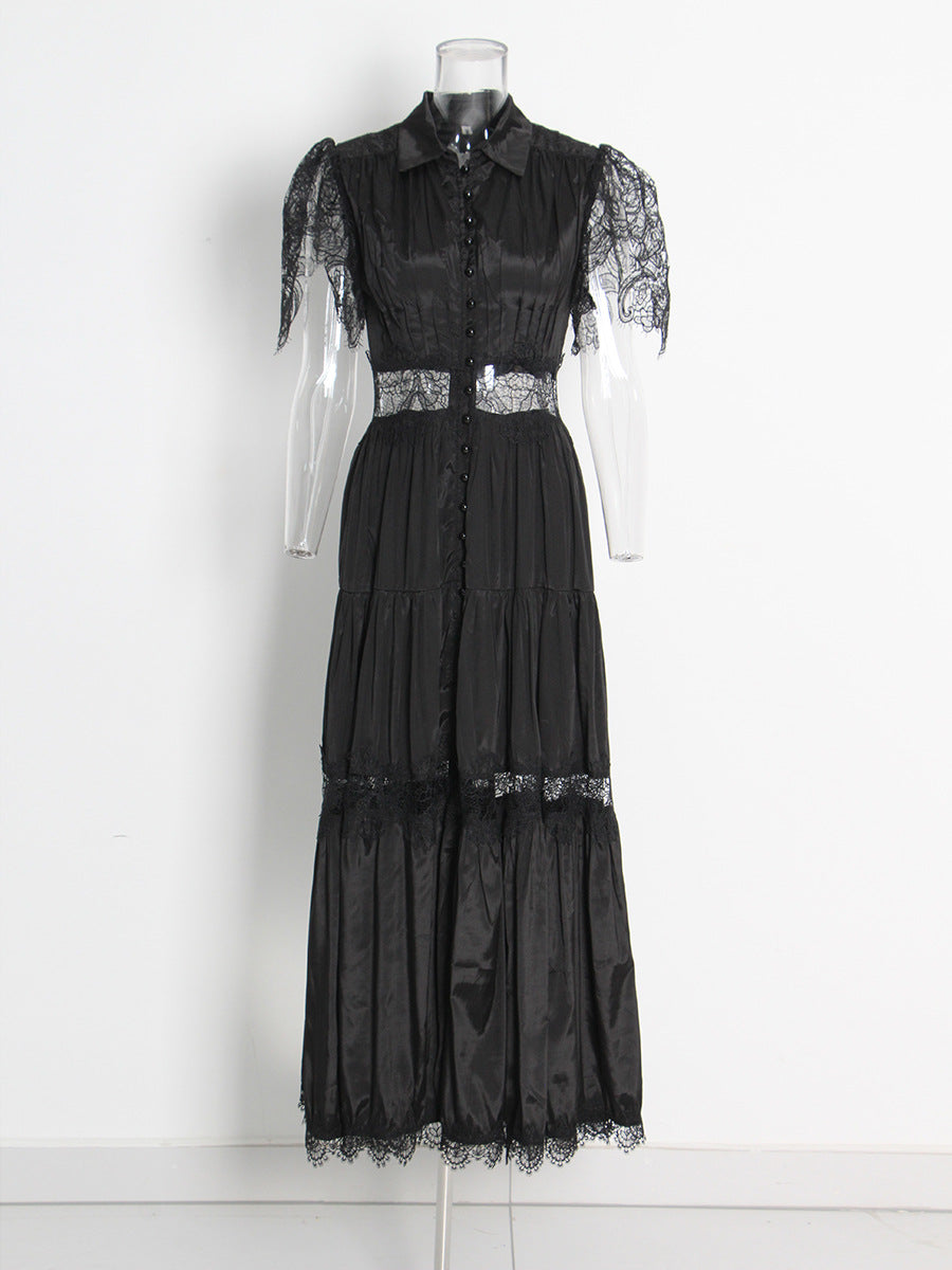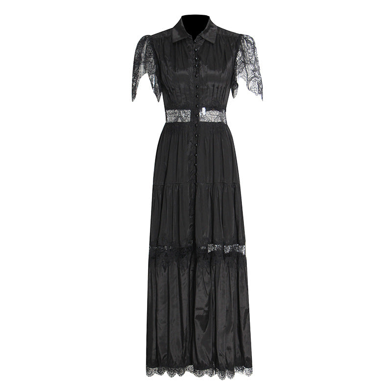 Plataz Black Rose Lace Stitched 2025 New Women's Summer Collar Short-Sleeved Long Solid Dress