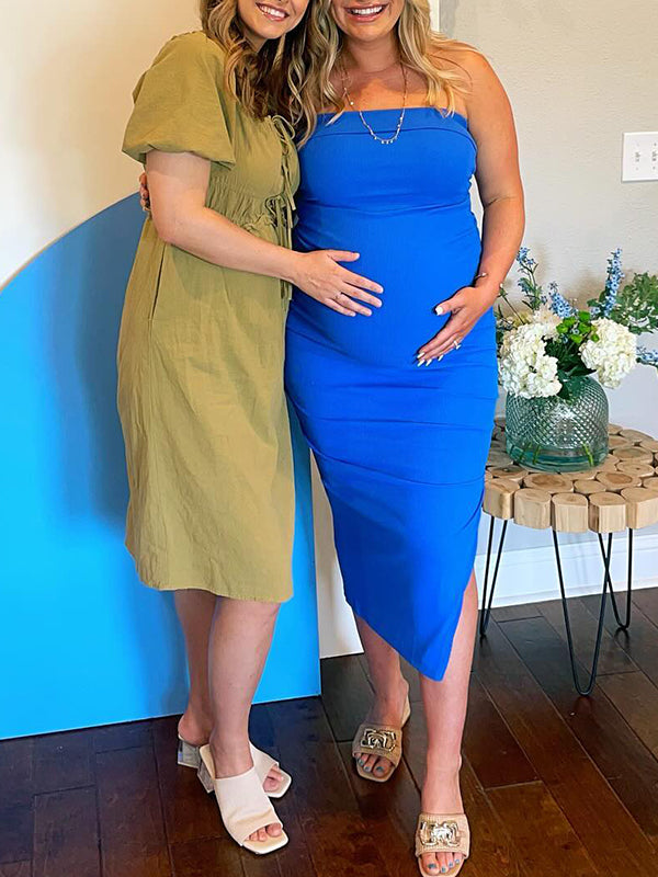 Plataz Blue Knit Bandeau Side Slit Strapless Bodycon Eleagnt Going Out Maternity Photoshoot Baby Shower Maxi Dress Maternity