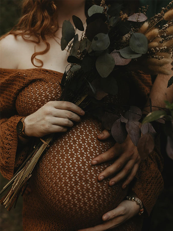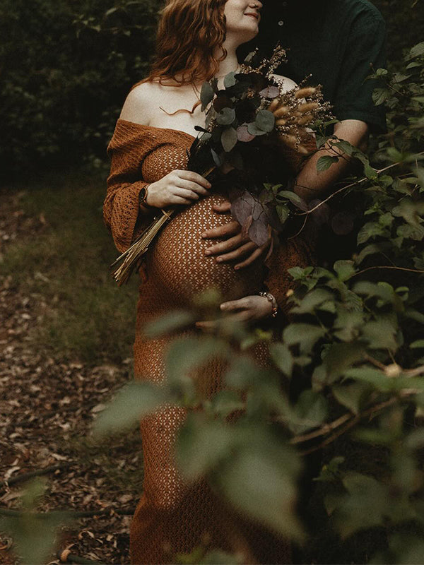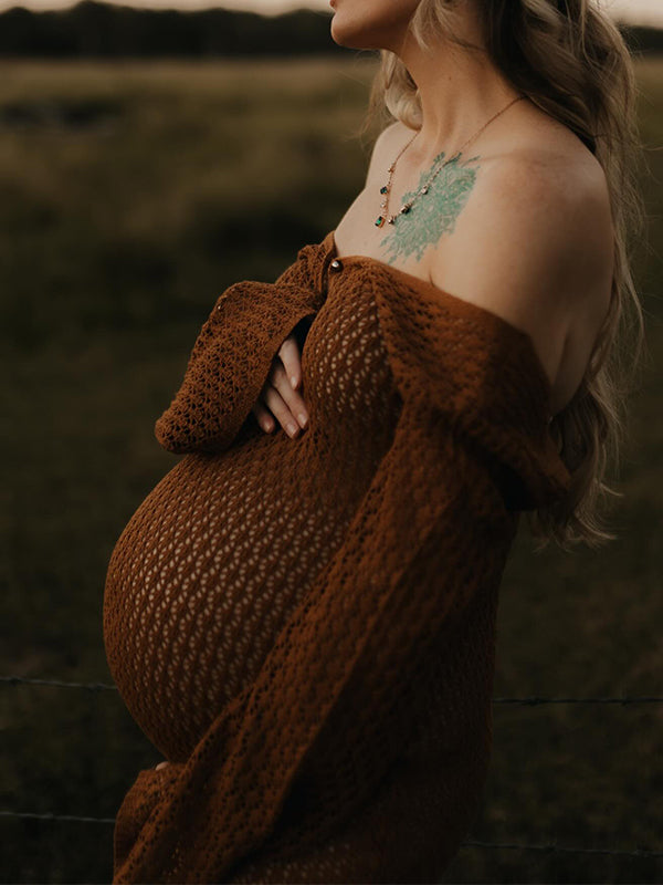 Plataz Coffee Color V-Neck Knitting Cut Out Beach Vacation Photoshoot Maternity Maxi Dress Maternity