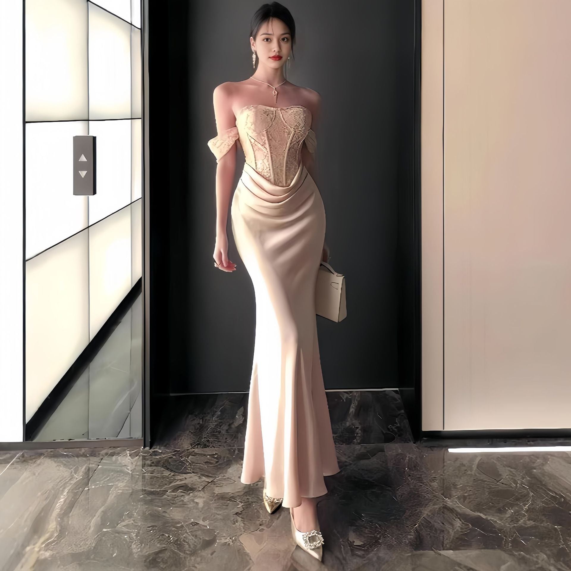 Plataz Concrettress New High-End Sexy Back Long Dress Dress A Word Shoulder Pure Lust Lace Corset Dress Dress Woman HZ0628