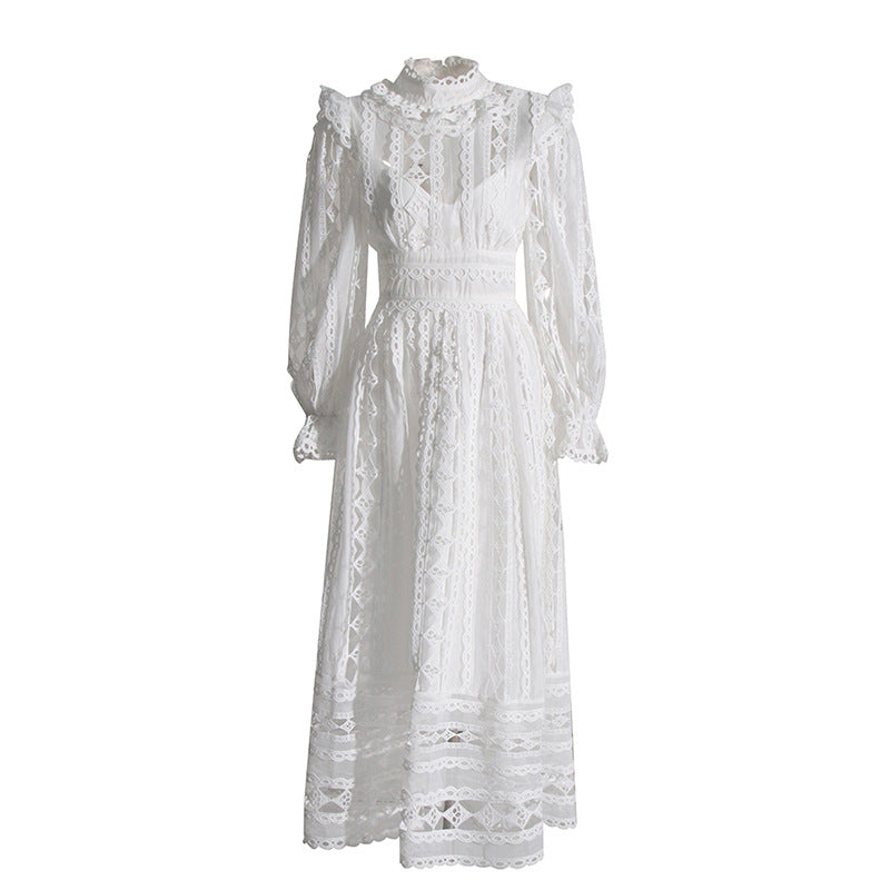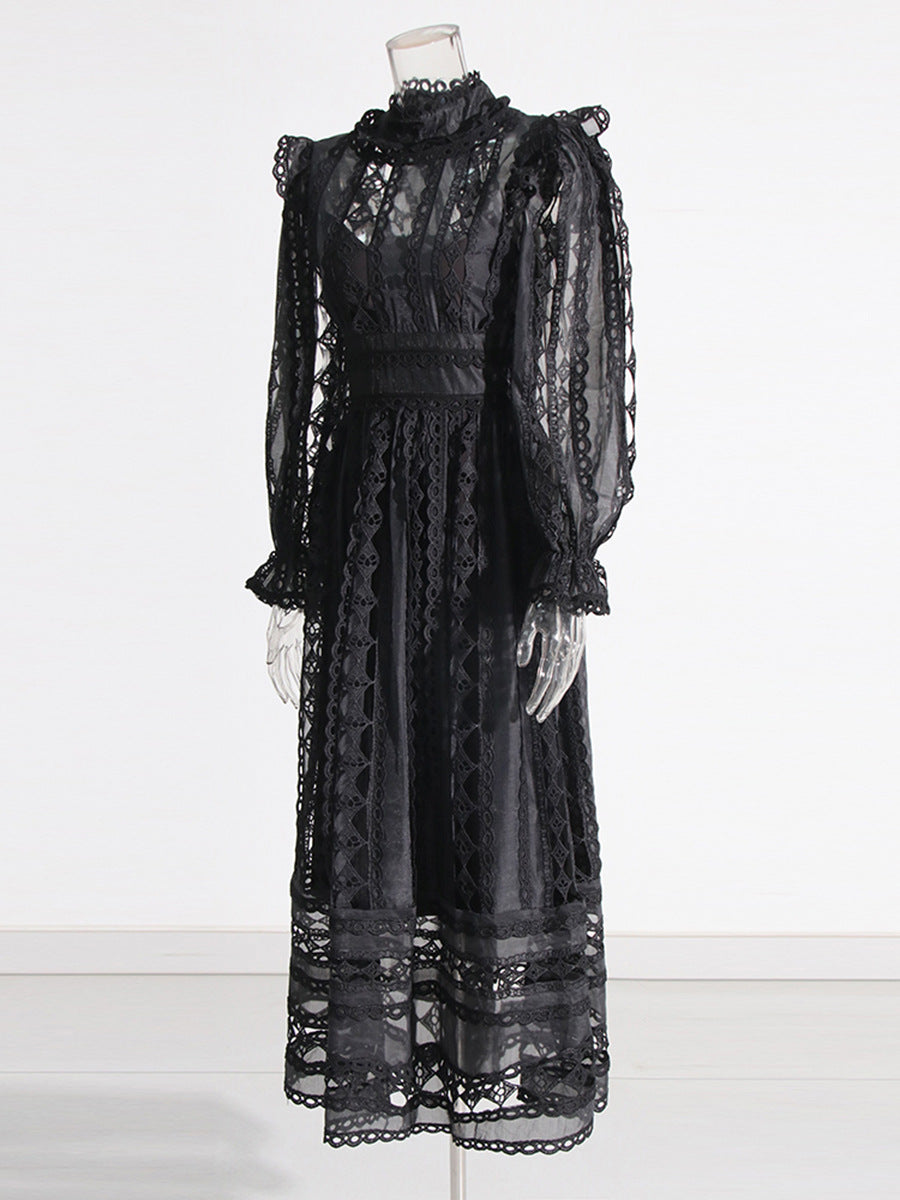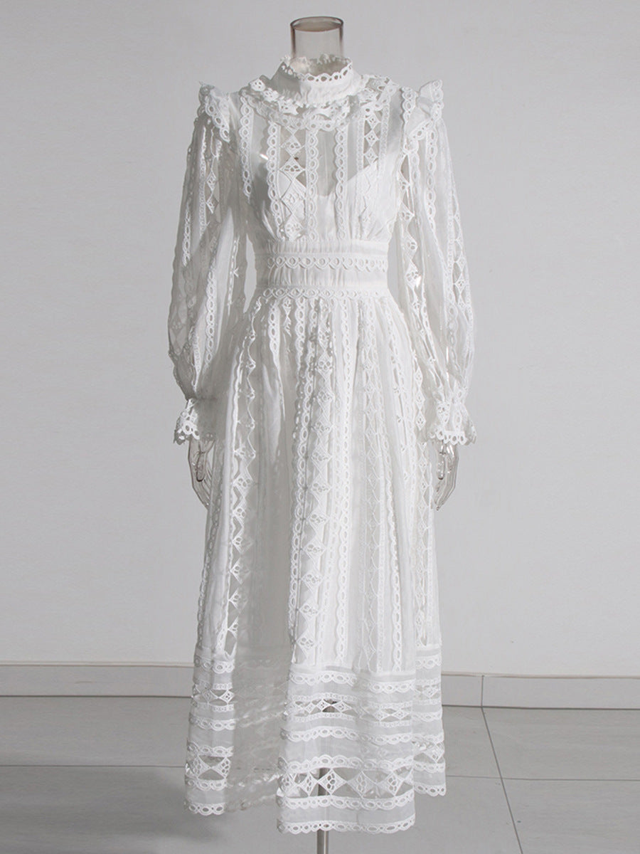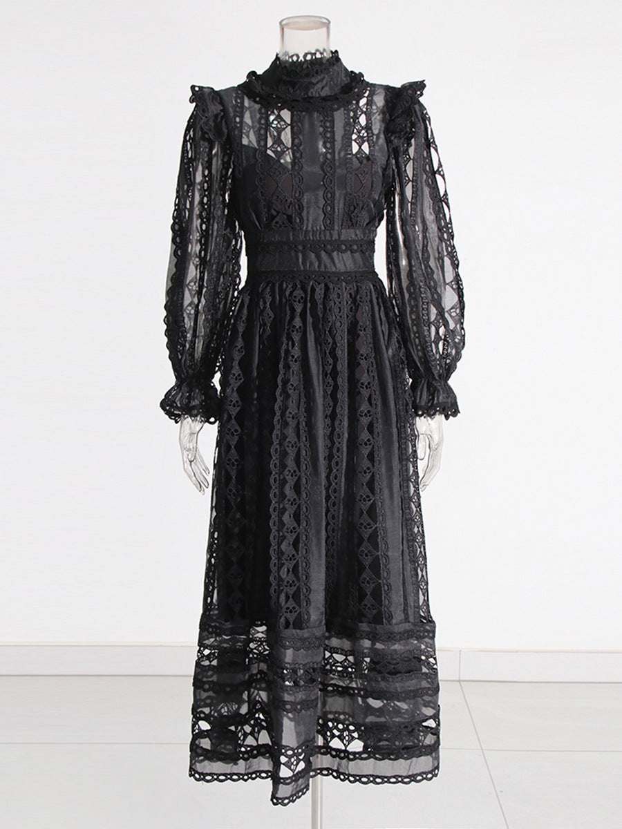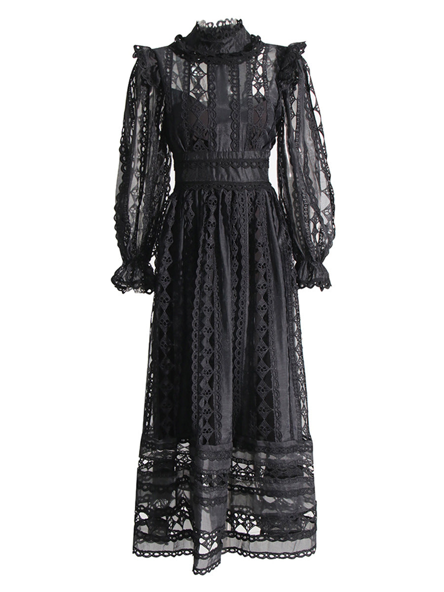 Plataz Court Dress Women's Dress Spring 2025 New Collar Lace Long Sleeves Embroidered High-Waisted Long Dress