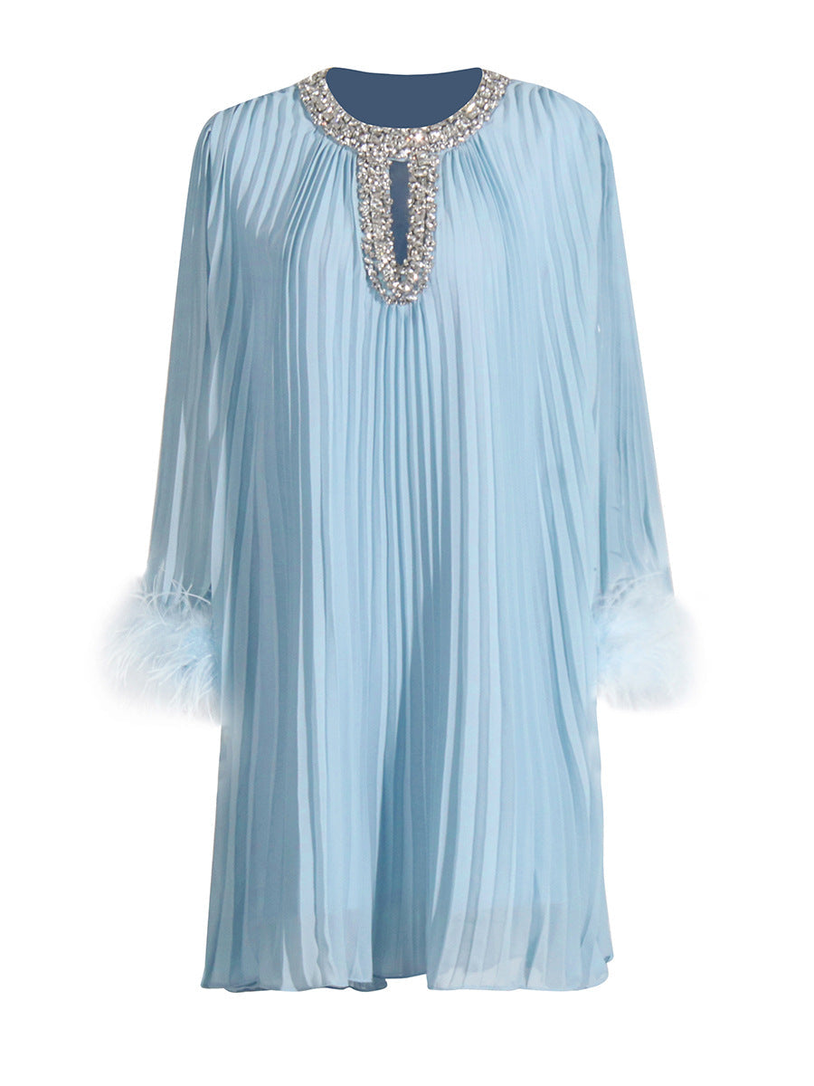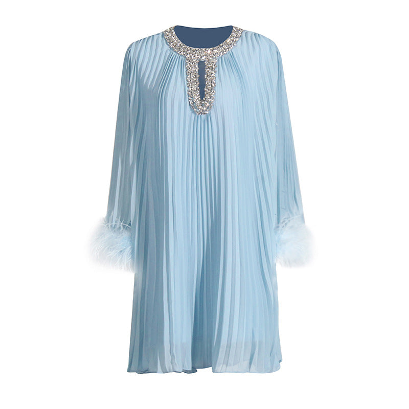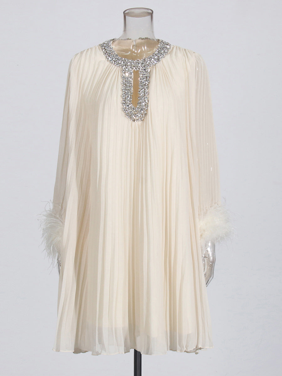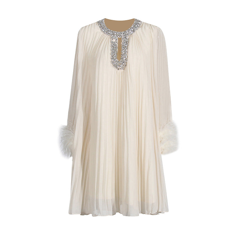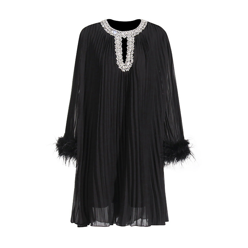 Plataz Court Niche Design Mid-Term 2025 New Diamond-Coated Collar Hollow Long-Sleeved Ostrich Wool Dress