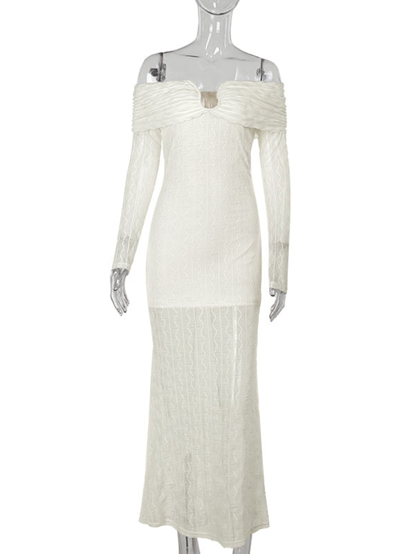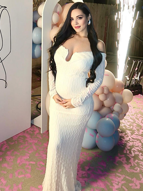 Plataz Cream White Off Shoulder Textured U-Wire Bodycon Elegant Maternity Baby Shower Maxi Dress Maternity